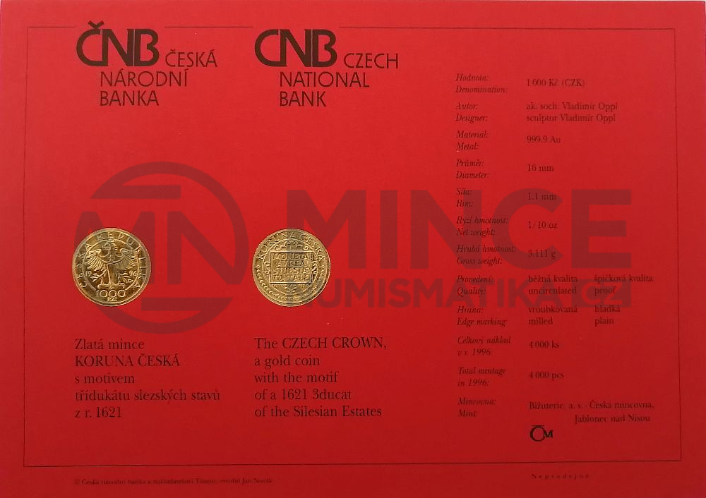 Mince uložena v kapsli a etue, přiložen certifikát ČNB.
