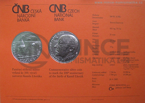 Mince uložena v kapsli a etuji (proof kvalita), ke každé minci se dodává katalogová karta oranžové barvy, na níž je popis mince a její plastické vyobrazení. Text je dvojjazyčný v češtině a angličtině. Karta je společná oběma provedením mince.
