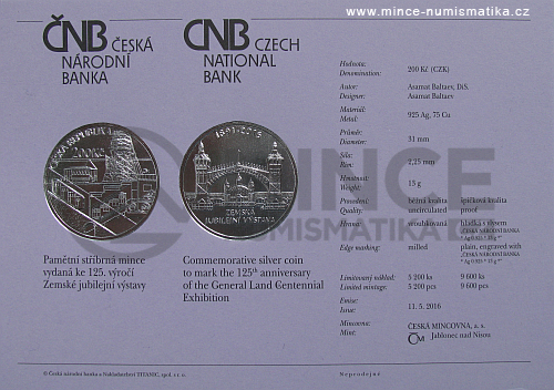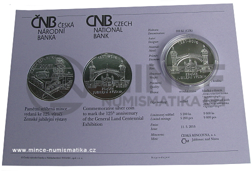 Pamětní stříbrná mince v hodnotě 200 Kč - Zemská jubilejní výstava v Praze, dokončení stavby Petřínské rozhledny, lanovky na Petřín a Letnou a první elektrické dráhy na Letnou.