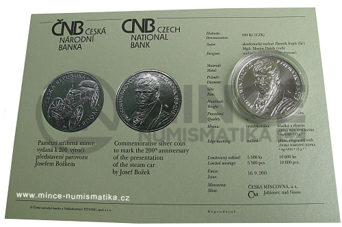 Na lícní straně mince je zobrazen parovůz sestrojený Josefem Božkem. Při levém horním okraji dvousetkoruny je název státu „ČESKÁ REPUBLIKA“. Označení nominální hodnoty mince se zkratkou peněžní jednotky „200 Kč“ je při pravém okraji dvousetkoruny. Název státu a označení nominální hodnoty mince jsou na začátku a na konci ohraničeny tečkami. Značka České mincovny tvořená kompozicí písmen „Č“ a „M“ je při spodním okraji dvousetkoruny. Nad značkou České mincovny jsou iniciály autora lícní strany dvousetkoruny akademického sochaře Zbyňka Fojtů, které jsou tvořeny spojenými písmeny „FZ“.