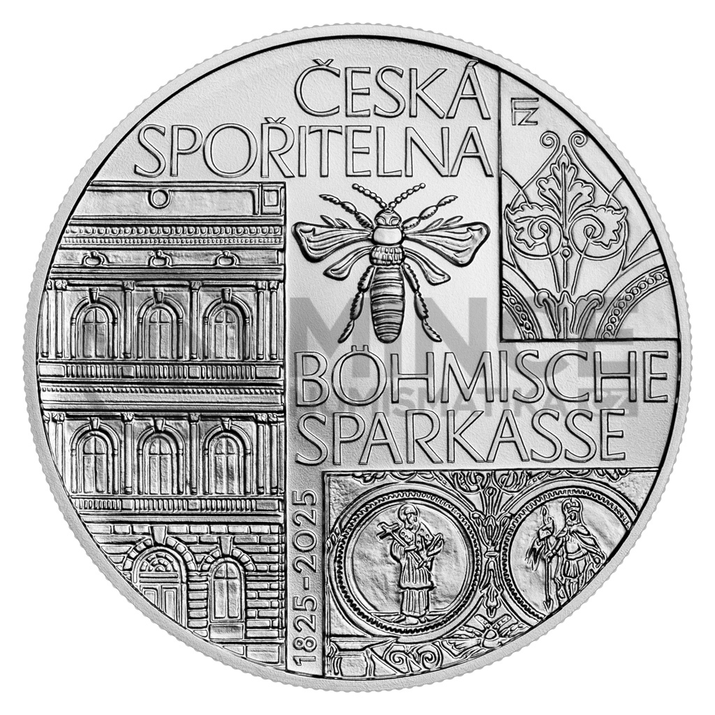 Na rubové straně dvousetkoruny je koláž tvořená částí první vlastní budovy české spořitelny na Národní třídě v Praze, včelou jako symbolem spořitelnictví a grafickými fragmenty z vkladních knížek Böhmische Sparkasse. Při horním okraji mince je text „ČESKÁ SPOŘITELNA“ a vpravo uprostřed mincovního pole je text „BÖHMISCHE SPARKASSE“. Text „1825 - 2025“ je vpravo od části budovy. Iniciály autora mince akademického sochaře Zbyňka Fojtů, které jsou tvořeny kompozicí písmen „F“ a „Z“, jsou vpravo od textu „ČESKÁ“