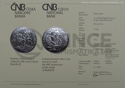 Mince uložena v kapsli a etuji (proof kvalita), ke každé minci se dodává katalogová karta krémové barvy, na níž je popis mince a její plastické vyobrazení. Text je dvojjazyčný v češtině a angličtině. Karta je společná oběma provedením mince.