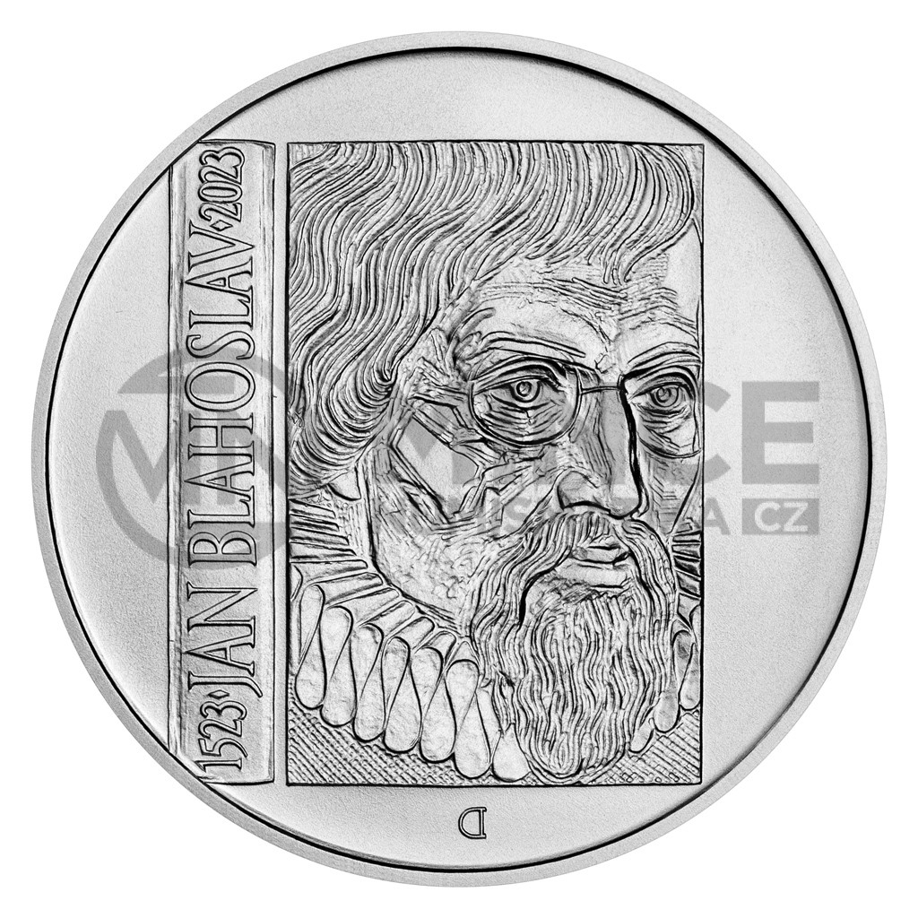 Na rubové straně dvousetkoruny je zachována kompozice lícní strany. Na místě titulní strany je ztvárněn portrét Jana Blahoslava a na hřbetu knihy se nachází text „1523 ♦ JAN BLAHOSLAV ♦ 2023“. Iniciála autora mince Vojtěcha Dostála, DiS., která je tvořena obráceným písmenem „D“, je umístěna při spodním okraji mince.
