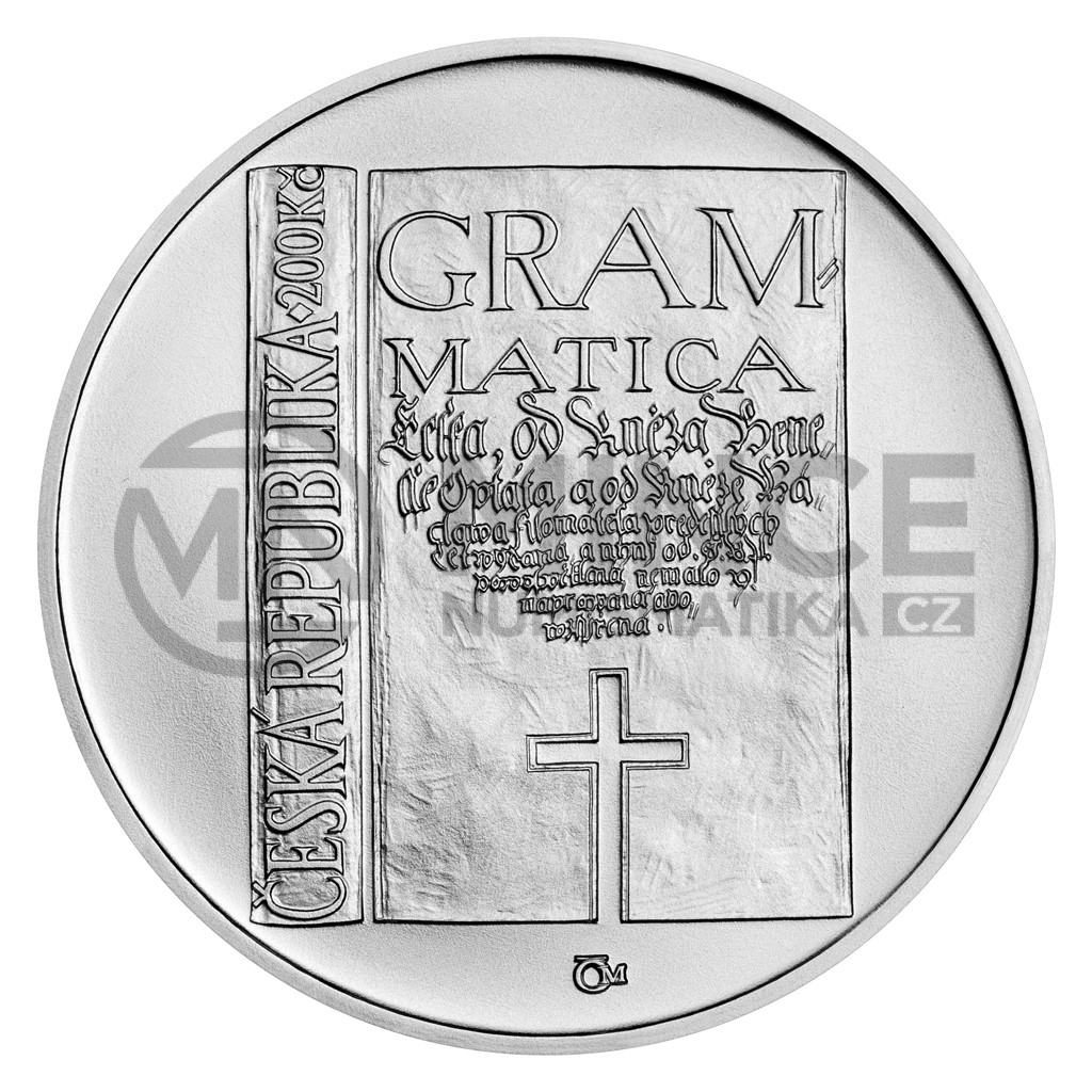 Na lícní straně dvousetkoruny je ztvárněna kompozice hřbetu a titulní strany knihy Gramatika česká z roku 1571. Titulní strana je doplněna o symbolický kříž. Na hřbetu knihy se nachází text „ČESKÁ REPUBLIKA ♦ 200 Kč“. Značka České mincovny tvořená písmeny „Č“ a „M“ je umístěna při spodním okraji mince.