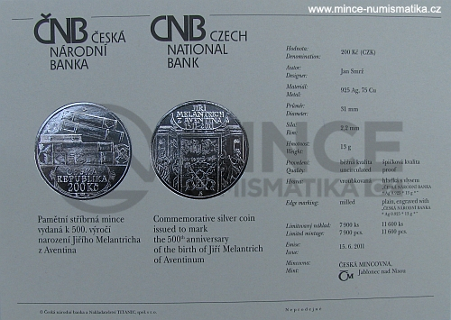 Mince uložena v kapsli a etuji (proof kvalita), ke každé minci se dodává katalogová karta šedohnědé barvy, na níž je popis mince a její plastické vyobrazení. Text je dvojjazyčný v češtině a angličtině. Karta je společná oběma provedením mince.