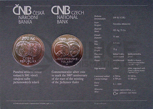 Mince uložena v kapsli a etuji (proof kvalita), ke každé minci se dodává katalogová karta tmavě šedé barvy, na níž je popis mince a její plastické vyobrazení. Text je dvojjazyčný v češtině a angličtině. Karta je společná oběma provedením mince.