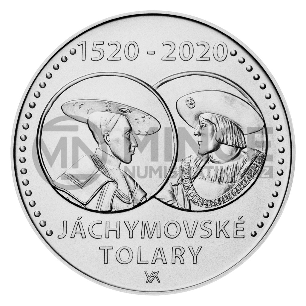 Na rubové straně dvousetkoruny je zachována kompozice lícní strany, v kruzích jsou ztvárněny portréty vydavatelů jáchymovských tolarů, vlevo hraběte Štěpána Schlika a vpravo českého krále Ludvíka Jagellonského. Po obvodu mince je neúplný perlovec. Při horním okraji mince se nacházejí letopočty „1520–2020“. Text „JÁCHYMOVSKÉ TOLARY“ je umístěn při dolním okraji mince. Iniciály autorky mince Veroniky Adamcové, které jsou tvořeny kompozicí písmen „V“ a „A“, jsou umístěny pod textem „TOLARY“.
