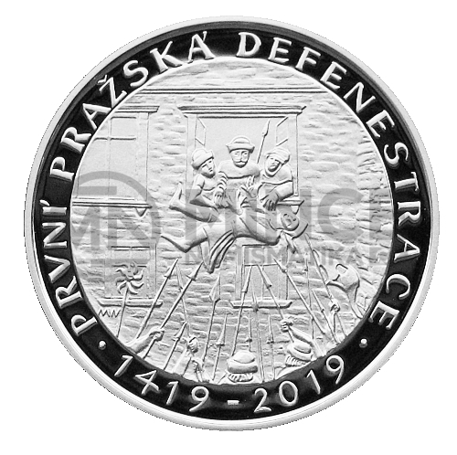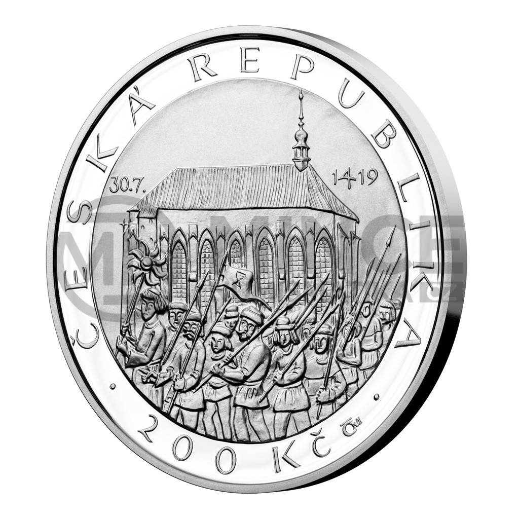 Na rubové straně dvousetkoruny je zachycen samotný akt defenestrace. Po obvodu mince je umístěn v mezikruží text „PRVNÍ PRAŽSKÁ DEFENESTRACE“ a letopočty „1419 – 2019“. Iniciály autorky mince, akademické sochařky Majky Wichnerové, které jsou tvořeny kompozicí písmen „M“ a „W“, jsou umístěny pod levým spodním oknem.
