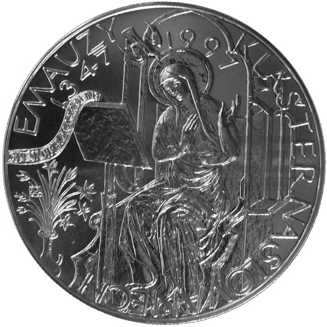 Na rubové straně mince je zobrazen fragment z fresky " Zvěstování Panny Marie " z ambitu kláštera. Název kláštera "KLÁŠTER NA SLOVANECH - EMAUZY " je v děleném opisu při okraji mince. Letopočty "1347 - 1997" autor umístil v opisu do obrazu v horní části mince.
