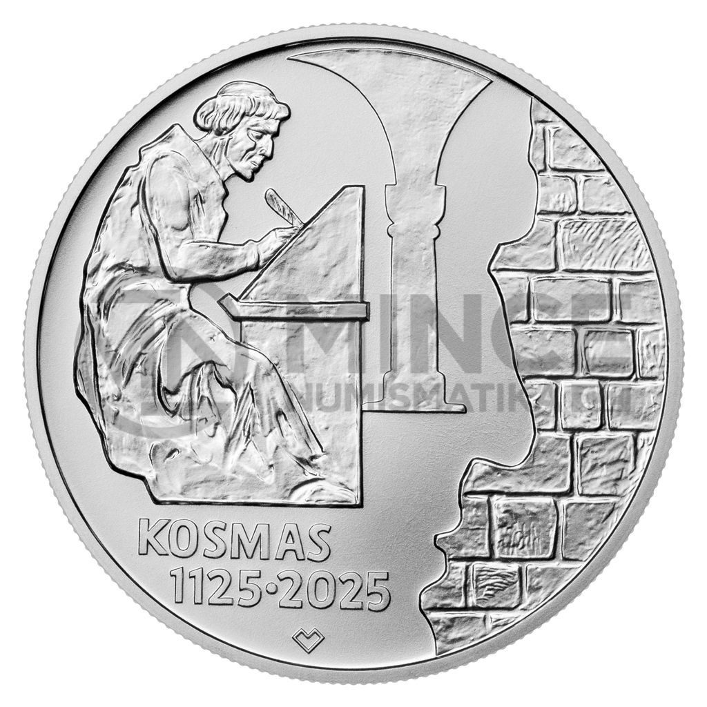 Na rubové straně dvousetkoruny je vlevo ztvárněn píšící kronikář a vpravo románský sloup, silueta obličeje a zděná stěna. Pod ztvárněním kronikáře jsou ve dvou řádcích texty „KOSMAS“ a „1125•2025“. Iniciály autora mince akademického sochaře Michala Vitanovského, které jsou tvořeny spojenými písmeny „MV“, jsou umístěny při dolním okraji mince.