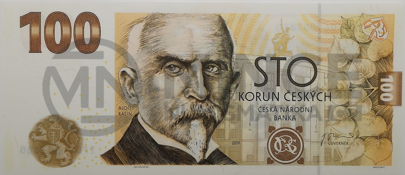 Hlavním hrdinou lícové strany papírového platidla se stal Alois Rašín, první československý ministr financí a tvůrce naší měny. Nominální hodnota pamětní bankovky činí 100 Kč čili stejně jako v případě klasické oběžné bankovky s motivem Karla IV. Alois Rašín však Otce vlasti v oběhu nenahradí – nová bankovka je určena výhradně sběratelům.