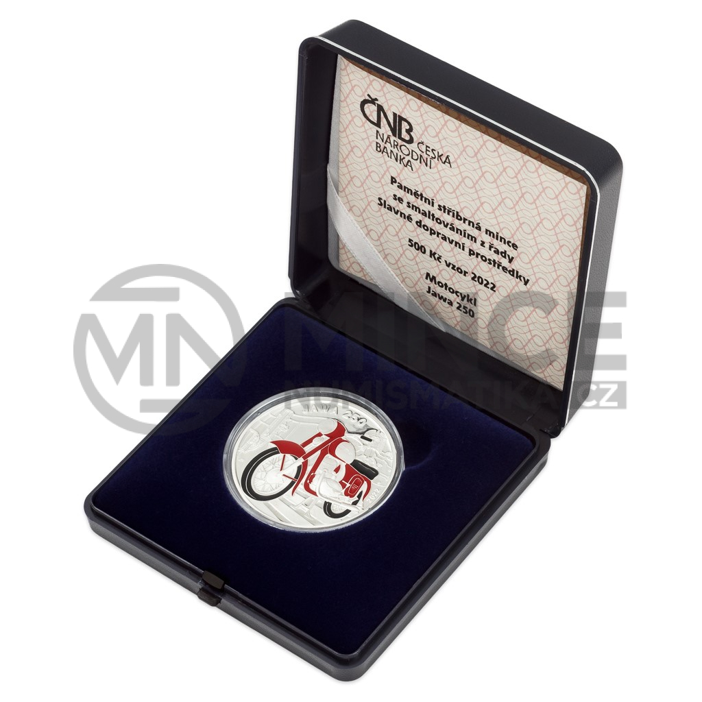 Na lícní straně pětisetkoruny jsou zobrazeny tři pohledy na části motocyklu Jawa 250. Při levém horním okraji mince je umístěn text „ČESKÁ“. Při pravém spodním okraji mince je umístěn text „REPUBLIKA“. Označení nominální hodnoty mince se zkratkou peněžní jednotky „500 Kč“ se nachází v pravé horní části mince. Značka České mincovny, která je tvořena kompozicí písmen „Č“ a „M“, je umístěna při levém spodním okraji mince.