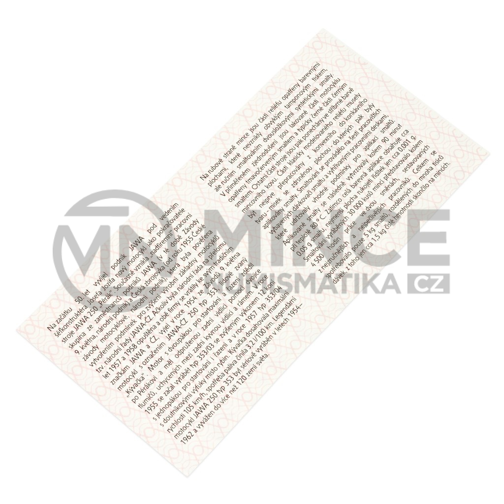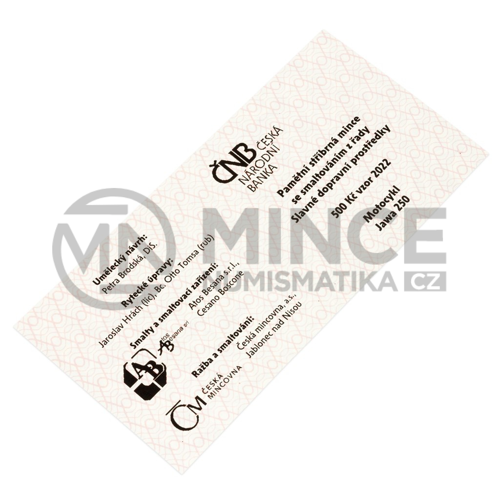 V rámci technického ozvláštnění mincí této pětisetkorunové řady budou části motocyklu opatřeny barevnými prvky na bázi dvousložkových pryskyřic.
