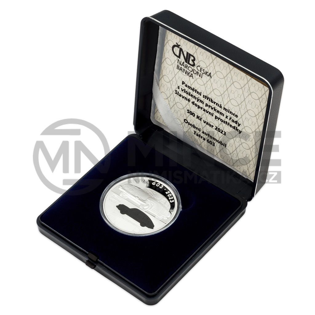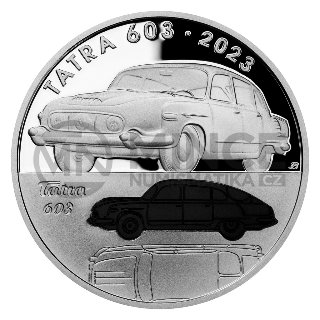 Rubová strana pětisetkoruny je vodorovně rozdělena na dvě části. V horní části je ztvárněn osobní automobil Tatra 603 ze šikmého pohledu. Ve spodní části mince je zobrazen technický výkres automobilu z bočního pohledu a část technického výkresu automobilu z horního pohledu. Boční pohled na automobil je proveden jako vložený prvek černé barvy. Při horním okraji mince jsou texty „TATRA 603“ a „2023“, které jsou od sebe odděleny tečkou. Vlevo od automobilu z bočního pohledu je ztvárněna značka automobilu v podobě znaku jeho výrobce. Iniciály autorky mince Petry Brodské, DiS., které jsou tvořeny propojenými písmeny „P“ a „B“, jsou umístěny při pravém okraji mince.