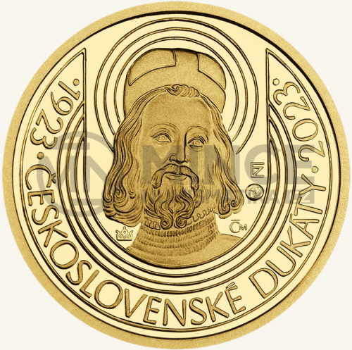 Reverz U reverzu je ve vrchní části detail obličeje sv. Václava s knížecí čepicí. Kolem hlavy má svatozář – gloriolu, vytváří ji 3 kruhy, tento výtvarný prvek se stal inspirací pro všechny linie na obou stranách dukátů. Zvolil jsem zobrazení sochy sv. Václava od Petra Parléře v katedrále sv. Víta. Kompozice obsahuje text s letopočty 1923. Československé dukáty. 2023.