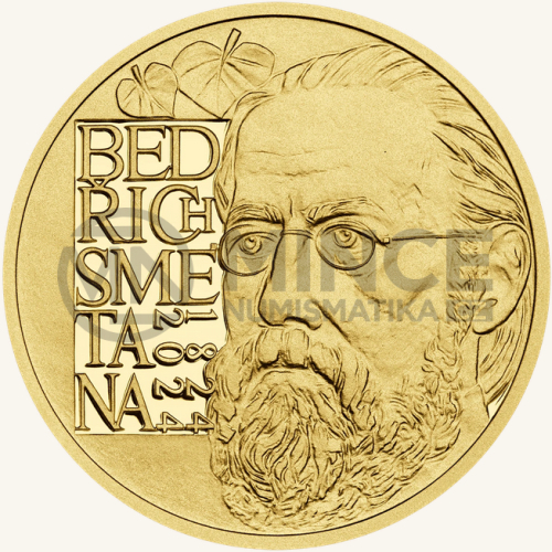 „zrcadlové“ plochy současně evokuje partituru, na níž jsou litery skladatelova jména v roli not a letopočty v úloze dvojité taktové čáry. Kompozici doplňuje stylizované zpodobení lipového listu jako symbolu našeho národa a provázání tvorby Bedřicha Smetany s vlastí.