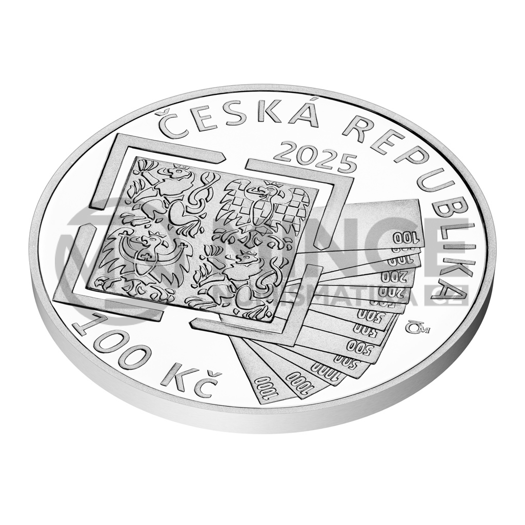 Na lícní straně stokoruny je v popředí vlevo kompozice heraldických zvířat z velkého státního znaku České republiky v rámečku tvořeném 4 směrovými šipkami symbolizujícím oběh zboží. V pozadí vpravo od rámečku je vějíř stylizovaných bankovek různých nominálních hodnot. Při horním okraji mince je v opisu text „ČESKÁ REPUBLIKA“ a pod ním ročník ražby „2025“. Označení nominální hodnoty se zkratkou peněžní jednotky „100 Kč“ je při dolním okraji mince. Značka České mincovny tvořená písmeny „Č“ a „M“ je při pravém okraji mince.