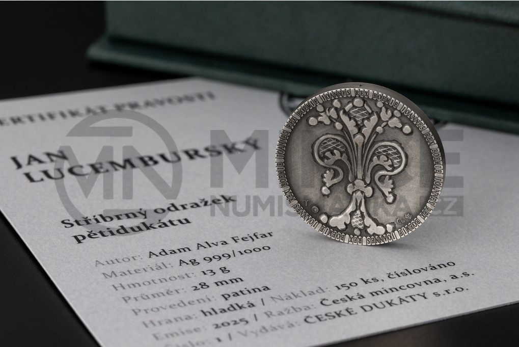 Averzní strana nese portrét Jana Lucemburského – krále, který pozvedl prestiž české koruny a získal si pověst rytíře napříč Evropou. Jeho tvář tu není pouze panovnickým symbolem, ale nositelem ideálů cti, odvahy a státnické vize. Reverz zdobí stylizovaná lilie, přímý odkaz na slavný florén – minci, kterou nechal Jan razit, aby české země zařadil po bok velmocí své doby.