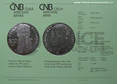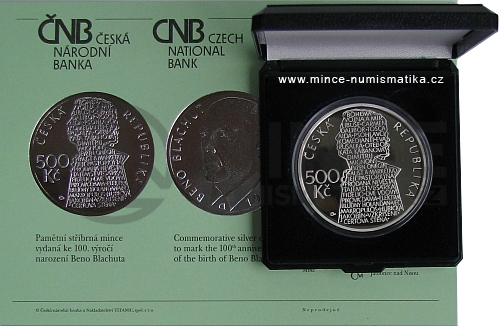 Na lícní straně mince je obrys postavy Beno Blachuta v roli prince z opery Antonína Dvořáka „Rusalka“. Uvnitř postavy jsou vypsány názvy některých oper, ve kterých Beno Blachut vystupoval. Při levém a pravém okraji mince je název státu „ČESKÁ REPUBLIKA“. Vlevo od postavy Beno Blachuta je označení nominální hodnoty mince se zkratkou peněžní jednotky „500 Kč“. Minci razila Česká mincovna v Jablonci nad Nisou. Její značka tvořená kompozicí písmen „Č“ a „M“ je při levém spodním okraji mince.