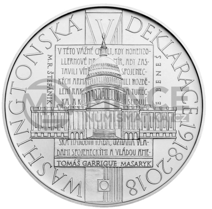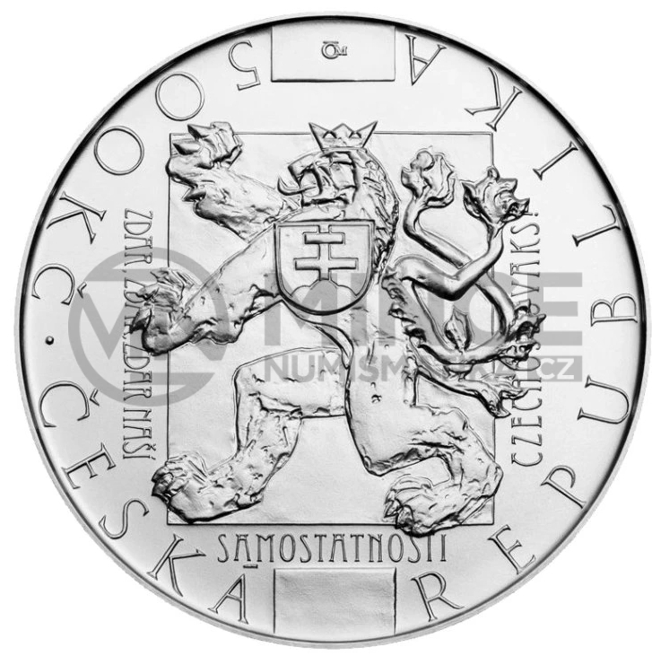 Na lícní straně mince je na obrysu listiny Washingtonské deklarace vyobrazena heraldická figura českého lva nesoucího na hrudi srdeční štítek znázorňující znak Slovenska. Vlevo, dole a vpravo od obrysu listiny se nachází text „ZDAR, ZDAR, ZDAR NAŠÍ SAMOSTATNOSTI CZECHOSLOVAKS!“. Po obvodu pětisetkoruny je v opisu označení nominální hodnoty mince se zkratkou peněžní jednotky „500 Kč“ a text „ČESKÁ REPUBLIKA“, které jsou od sebe odděleny tečkou. Značka České mincovny, která je tvořena kompozicí písmen „Č“ a „M“, je umístěna při horním okraji mince.