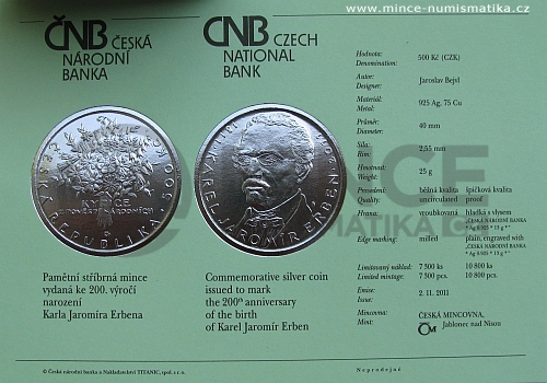Na rubu mince se nachází portrét Karla Jaromíra Erbena. Po obvodu pětisetkoruny je v neuzavřeném opisu text „KAREL JAROMÍR ERBEN“, který je na okrajích ohraničen letopočty „1811“ a „2011“. Při pravém okraji portrétu je značka autora pětisetkoruny Jaroslava Bejvla, která je tvořena písmeny „J“ a „B“.
