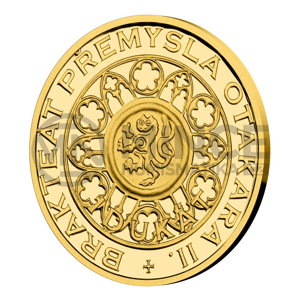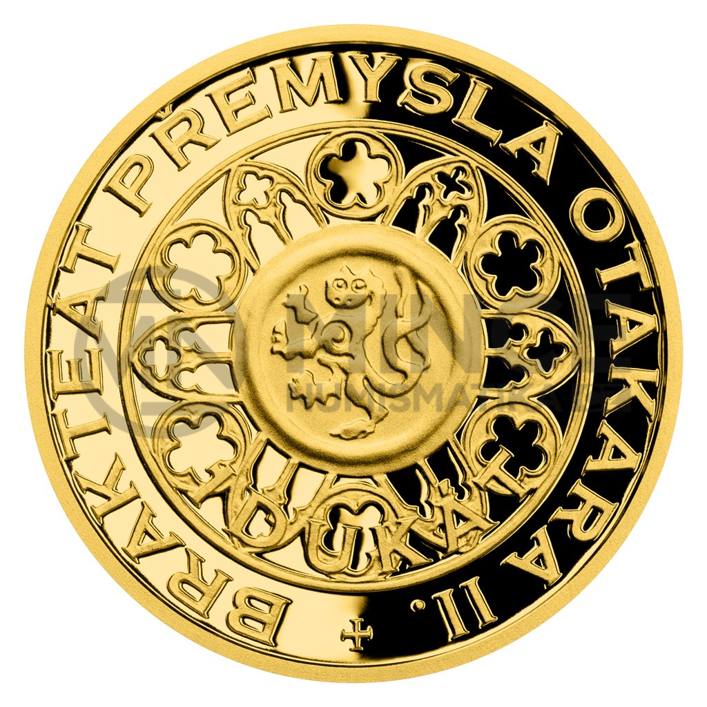 Medailér Mgr. Petr Horák věnoval averzní stranu dukátu vyobrazení královy mince, které vévodí dvouocasý lev. V opisu je uveden její název – BRAKTEÁT PŘEMYSLA OTAKARA II. Doplňkovým motivem je rozeta z kláštera Zlatá Koruna. Reverzní strana, která je společná všem čtyřem ražbám Dukátové řady, pak předkládá královy relikvie. Jeho lebku, jež byla rozťata v bitvě na Moravském poli, pohřební korunu a latinský opis převzatý z tohoto klenotu – HIC SUNT OSSA OTACARI INCLITI REGIS BOHEMIE QUINTI (zde jsou kosti Otakara, slavného pátého českého krále).