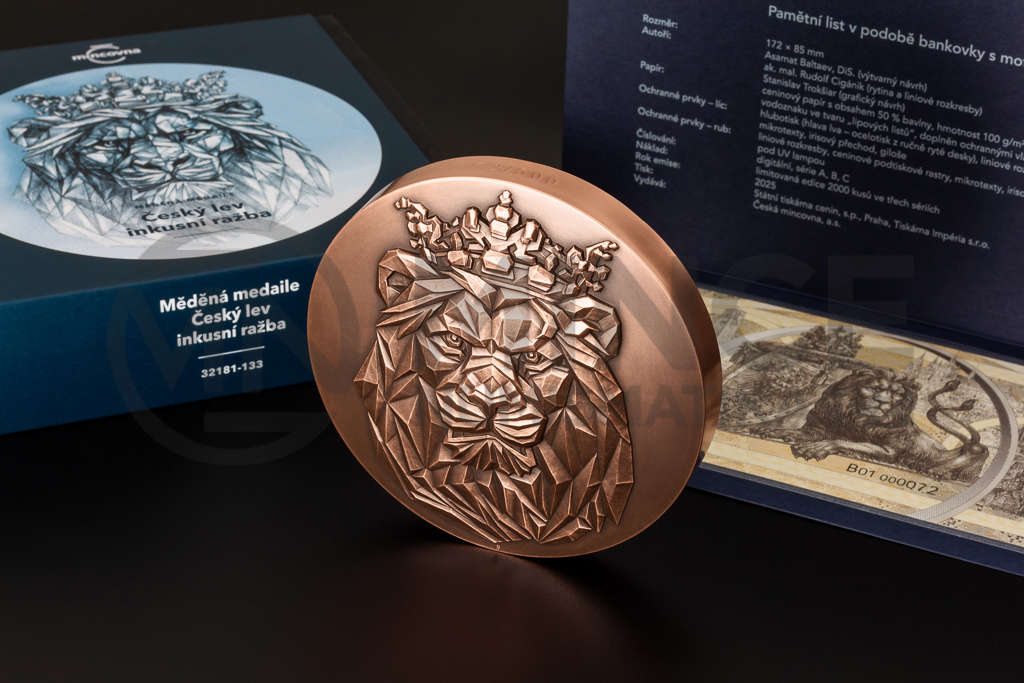 Český lev České mincovny, který v průběhu let dostal mnoho podob, je od samého počátku dílem Asamata Baltaeva, DiS. Ten se však v roce 2025 tohoto úkolu zhostil naposledy a na rozloučenou vytvořil výjimečnou sadu složenou z pamětní medaile a pamětního listu.