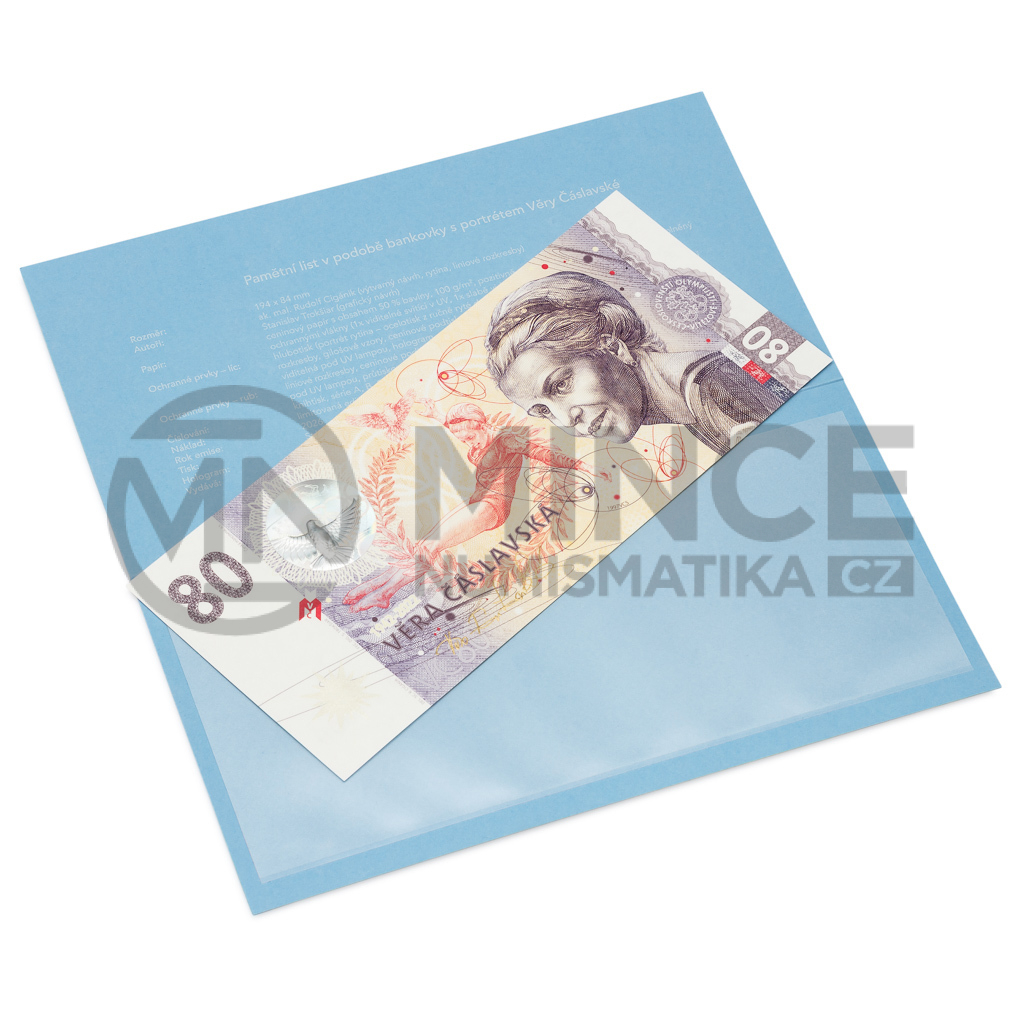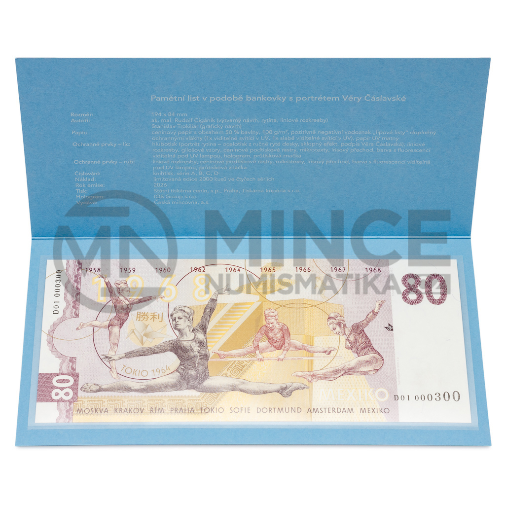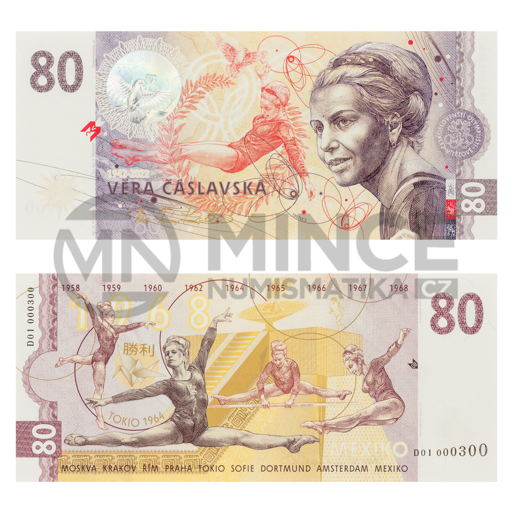 Věra Čáslavská byla nepřekonatelnou sportovkyní, jejíž rekord v počtu zlatých medailí dosud žádný olympijský gymnasta nepřekonal. Stala se však také ikonou odvahy a nezlomnosti. Hold jí vzdává paměťovka – čili pamětní list v podobě bankovky.