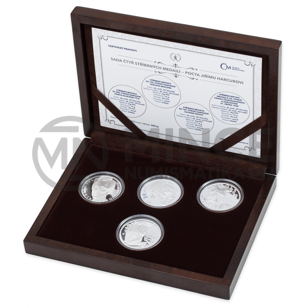 Jiří Harcuba patřil k výtvarníkům s nezaměnitelným rukopisem a jeho dílo právem dosáhlo světového věhlasu. Vynikal nejen v oblasti sklářského umění, ale svůj talent otiskl také do řady numismatických unikátů. Každý z nás zná jeho současnou českou pětikorunu. Česká mincovna se rozhodla vzdát hold jeho celoživotnímu dílu prostřednictvím mimořádné sady tří originálních medailí a jedné unikátní repliky.
