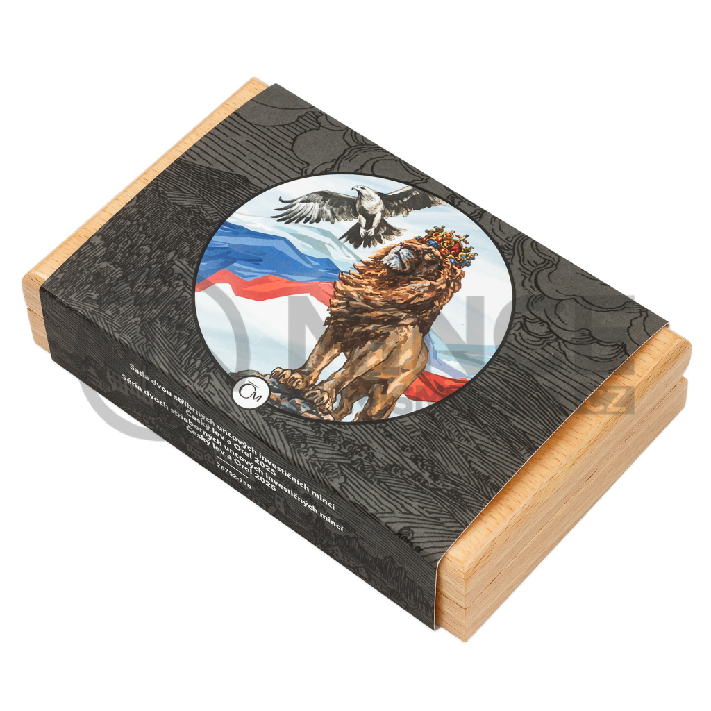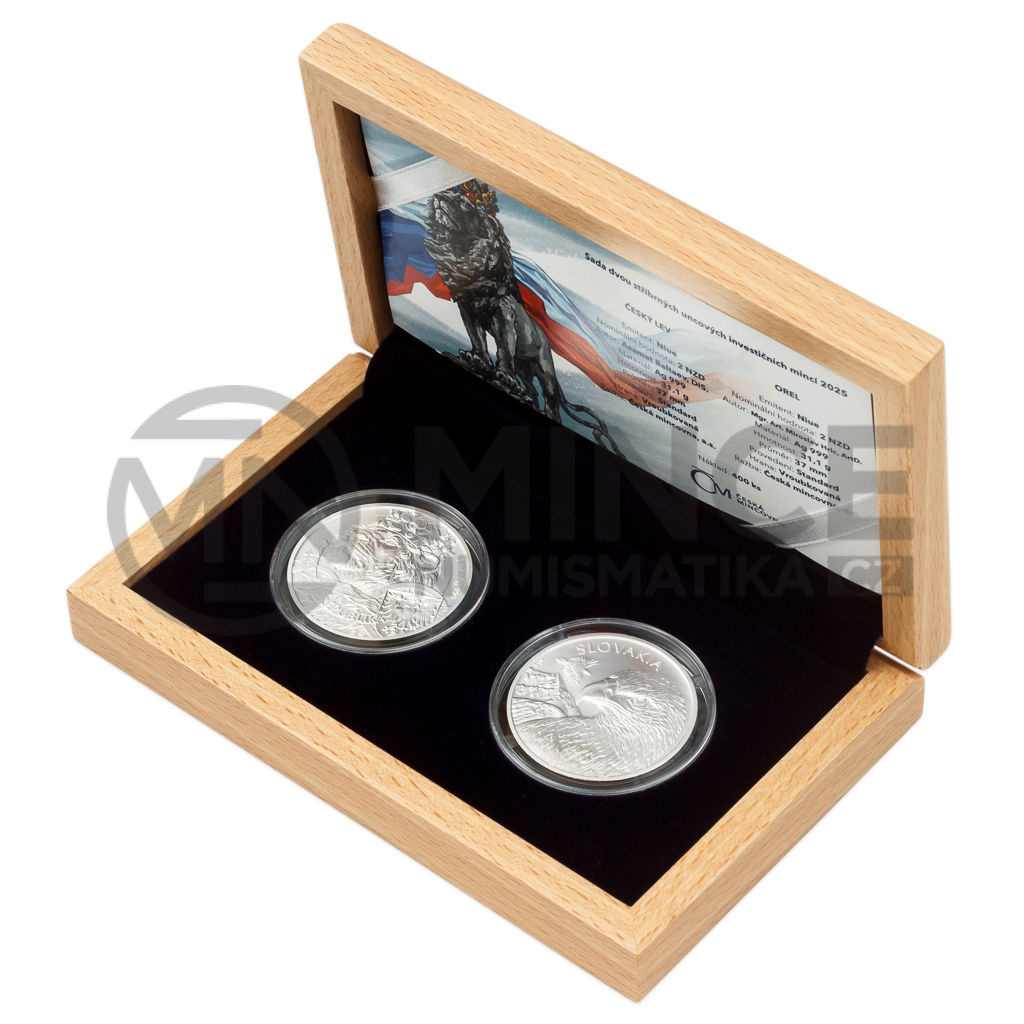 Sada, jejíž celková hmotnost čítá dvě trojské unce ryzího stříbra, obsahuje dvě investiční mince České mincovny – Českého lva a Orola s ročníkem 2025.