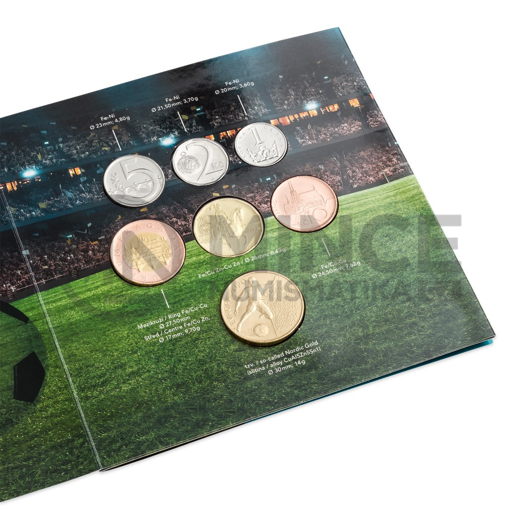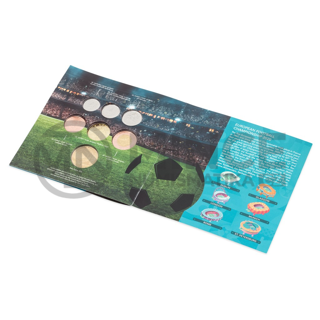 Sada ukrývá šest oběžných mincí s nominálními hodnotami 1, 2, 5, 10, 20 a 50 Kč, které byly vyraženy v roce 2020 a neprošly oběhem. Dalším dílem skládanky je speciální pamětní žeton medailéra Petra Patky, DiS. Zatímco averzní strana žetonu předkládá dynamickou figuru fotbalisty doplněnou výčtem dvanácti hostitelských měst, reverzní strana nese fotbalový míč, do kterého jsou vepsány názvy všech hostitelských zemí. Zvláštní pozornost je věnována anglickému Londýnu, kde se měl konat finálový zápas, a reverzu proto vévodí ještě ikonický Big Ben. To vše je uloženo do speciálního balení, které připomíná jednotlivé stadiony šampionátu.