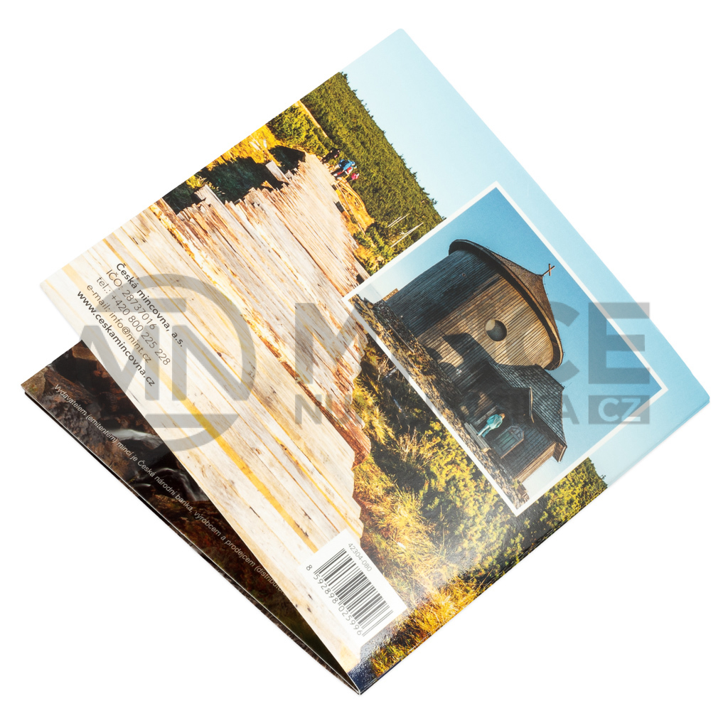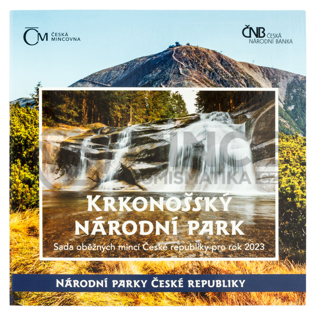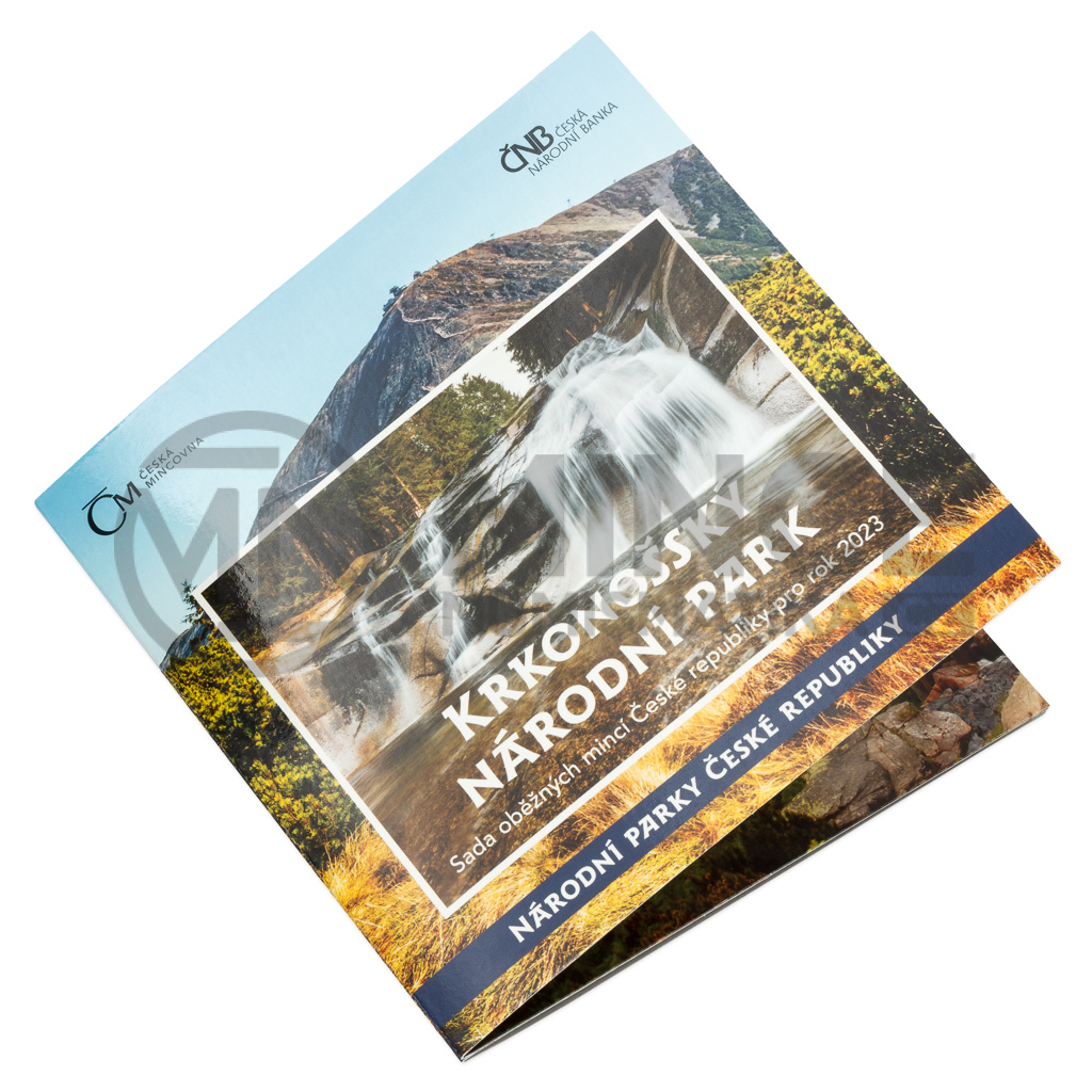 Živé i neživé krásy Krkonošského národního parku připomíná pamětní žeton z dílny Kristýny Šánové, DiS., který je nedílnou součástí sady. „Horní část reverzní strany žetonu patří nejvyššímu a zároveň nejznámějšímu bodu parku, kterým je Sněžka. Ve spodní části reverzu jsou zachyceny tři vzácné a chráněné krkonošské rostliny – prha arnika, zvonek český a hořec tolitovitý. Dvě z těchto květin se nacházejí přímo v logu KRNAPu. Protože přes 80 % plochy Krkonoš pokrývají lesy, v pozadí jsem použila motiv letokruhů dřeva, které vnímám jako symboliku přibývajících let národního parku… Horní část averzní strany je věnována Mumlavskému vodopádu, který patří k nejmohutnějším v České republice. Ve spodní části averzu najdete tři typická krkonošská zvířata – skokana hnědého, jelena evropského a sýce rousného. I zde se na pozadí objevuje motiv letokruhů,“ vysvětluje medailérka. V sadě oběžných mincí pochopitelně nemůže chybět oběživo – konkrétně šestice kovových platidel s nominálními hodnotami 1, 2, 5, 10, 20 a 50 Kč. Jednotlivé mince nesou ročník 2023 a nikdy neprošly oběhem.