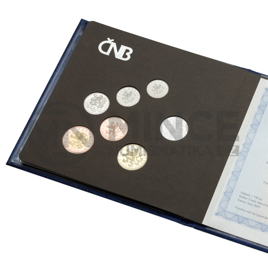 S oběžnými mincemi v hodnotách 1, 2, 5, 10, 20 a 50 Kč se Češi setkávají takřka denně. Projdou nespočtem lidských rukou, a mezi jejich nejdůležitější vlastnosti proto patří odolnost a trvanlivost. Naše mince jsou však vedle prostředku směny také malými uměleckými díly, a tak je Česká mincovna ve spolupráci s Českou národní bankou razí i v choulostivé kvalitě proof, která se vyznačuje zrcadlovým leskem a udělá radost každému sběrateli. Komplet vychází v roce 2023, kdy si připomínáme 30. výročí vzniku České mincovny a české měny.