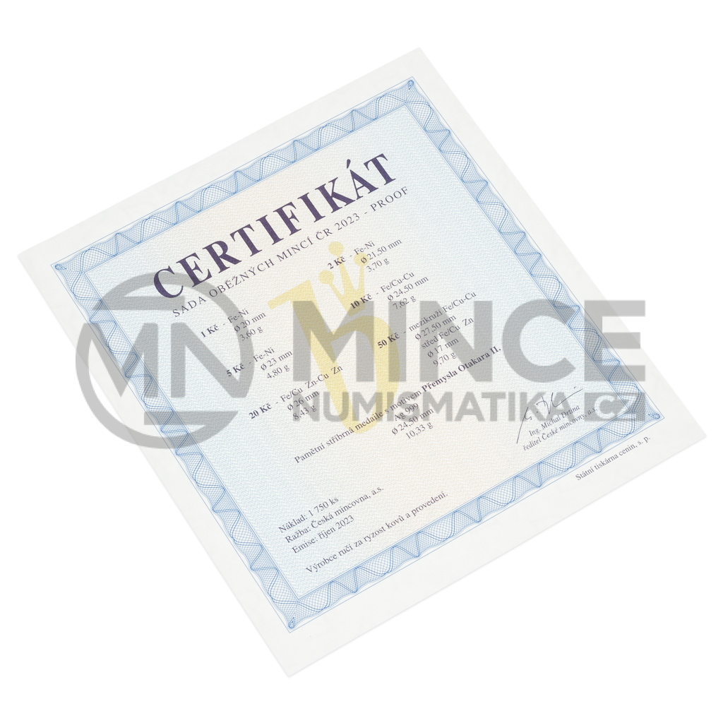 Komplet českého oběživa s ročníkem 2023 je v sadě doplněn pamětní medailí z ryzího stříbra s motivem Přemysla Otakara II. Medailér Mgr. Petr Horák věnoval její averzní stranu sedícímu králi, jehož podobu inspirovala socha na Prašné bráně. Opis uvádí panovníkovo jméno i obdivný alias – PŘEMYSL OTAKAR II., KRÁL ŽELEZNÝ A ZLATÝ. Doplňkovými motivy jsou Přemyslova heraldická zvířata a rozeta z kláštera Zlatá Koruna, který král založil. Reverzní strana medaile pak předkládá královy relikvie. Jeho lebku, která byla rozťata v bitvě na Moravském poli, pohřební korunu a latinský opis převzatý z tohoto klenotu – HIC SUNT OSSA OTACARI INCLITI REGIS BOHEMIE QUINTI (zde jsou kosti Otakara, slavného pátého českého krále).
