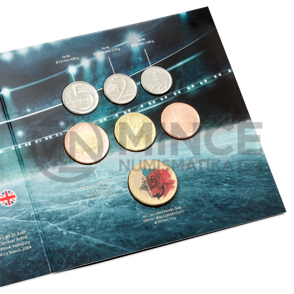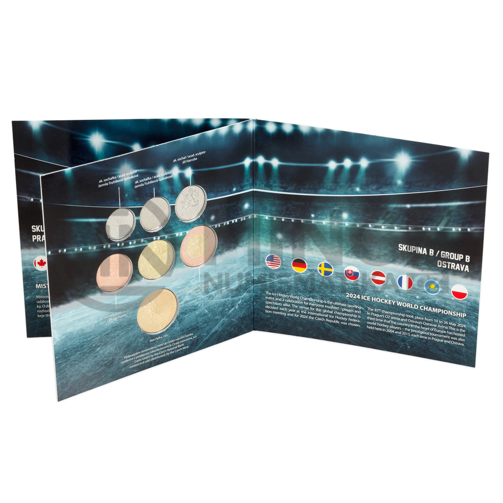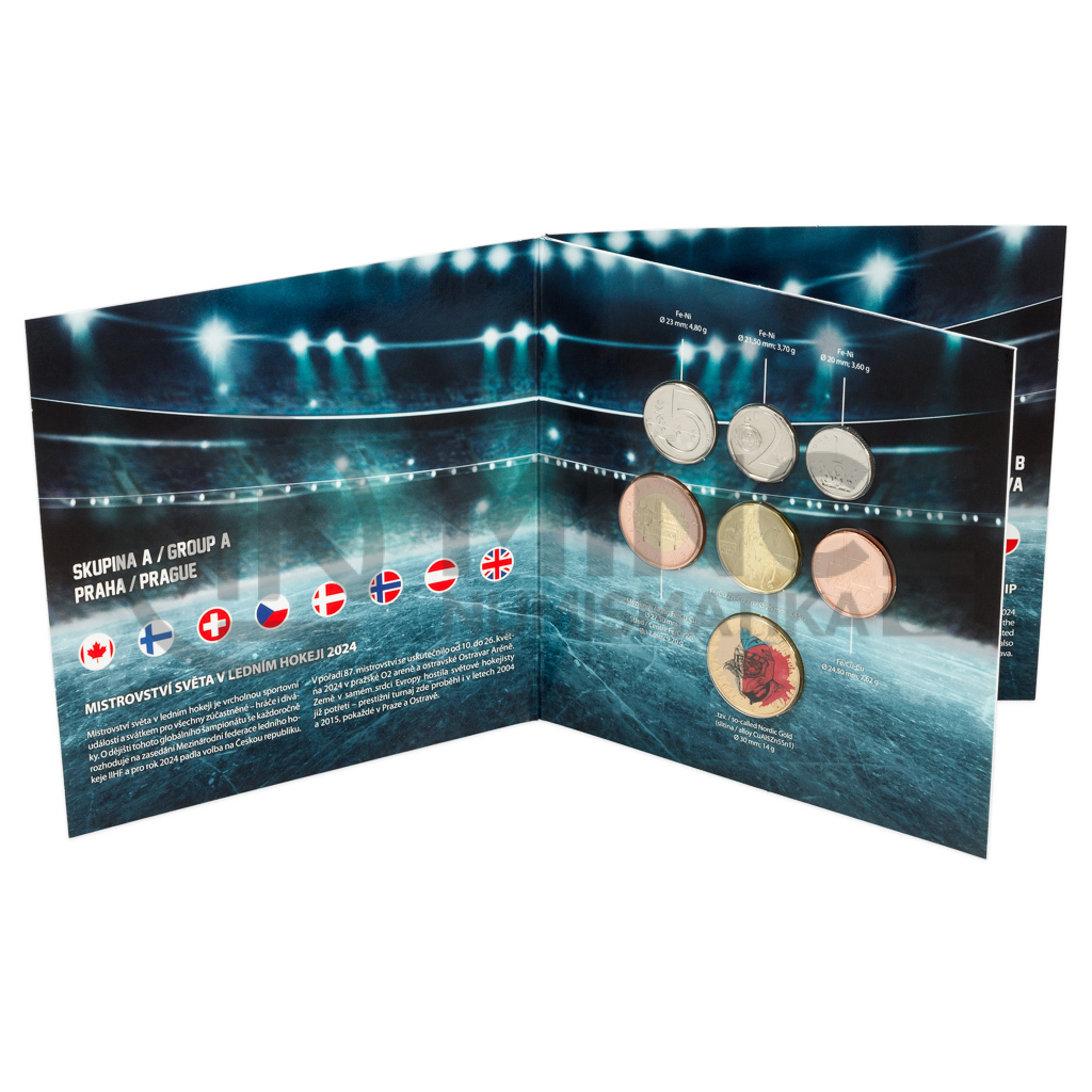 V sadě najdete šest oběžných mincí s nominálními hodnotami 1, 2, 5, 10, 20 a 50 Kč, které byly vyraženy v roce 2024 a neprošly oběhem. Dalším dílem skládanky je speciální pamětní žeton medailéra Petra Patky, DiS., s hokejovými motivy a kolorováním v barvách české vlajky.