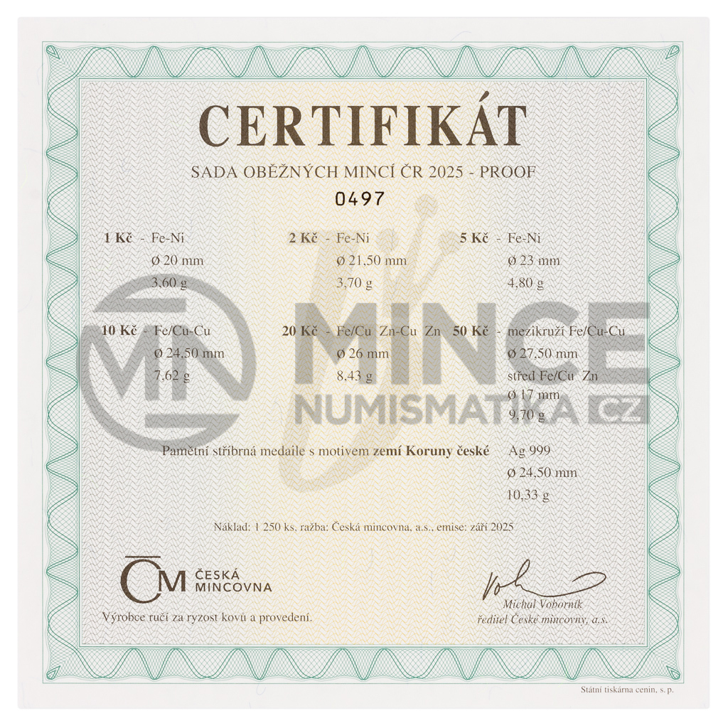Vedle šestice oběžných mincí s vyraženým letopočtem 2025 je součástí sady ještě stříbrná pamětní medaile. Tato ražba, která je dílem akademického sochaře Michala Vitanovského, je věnována historickým zemím Koruny české – averzní strana nese heraldická zvířata Čech, Moravy a Slezska a pohled do malebné krajiny; reverz předkládá českou vlajku, Svatováclavskou korunu a současné i historické hranice státu.