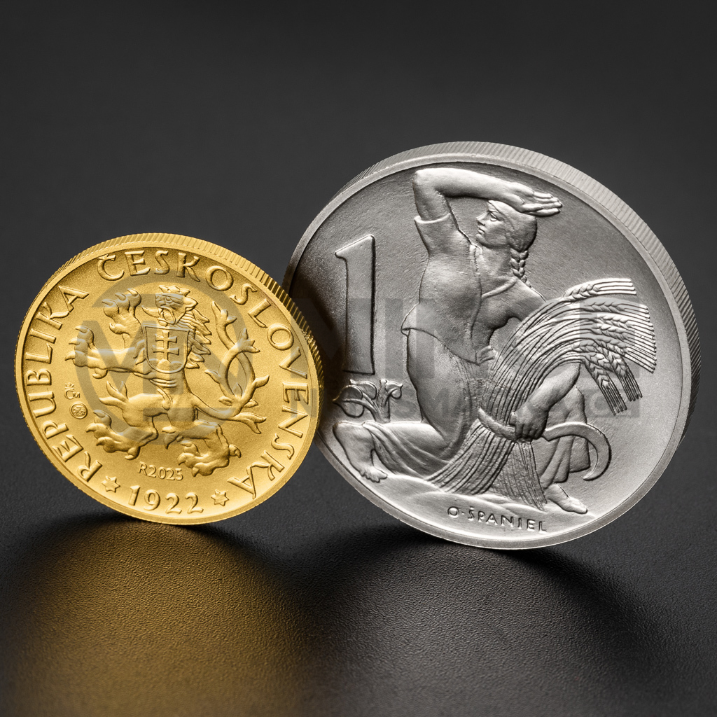 Obě novoražby v sadě jsou věrnou rekonstrukcí původních korunových mincí Otakara Španiela. Aby nedošlo k záměně s prvorepublikovými originály, pod dvouocasým lvem najdete drobný text R (jako replika) 2025.