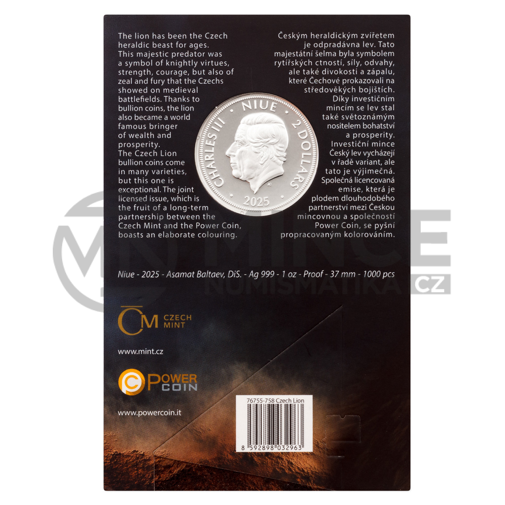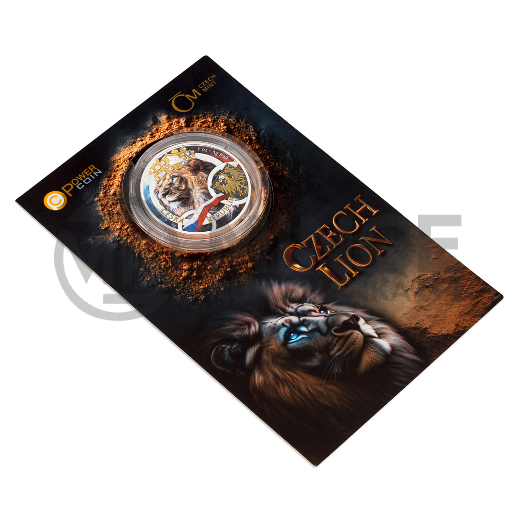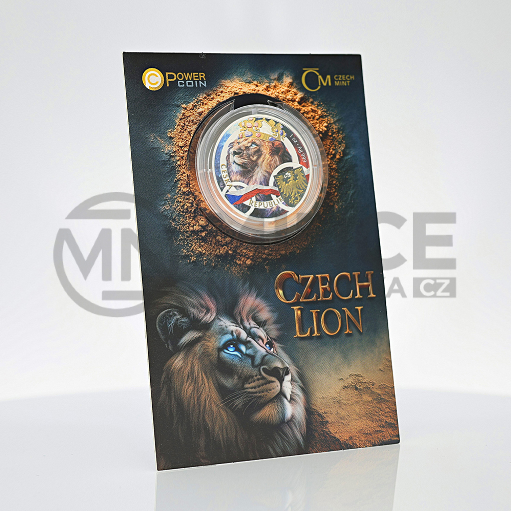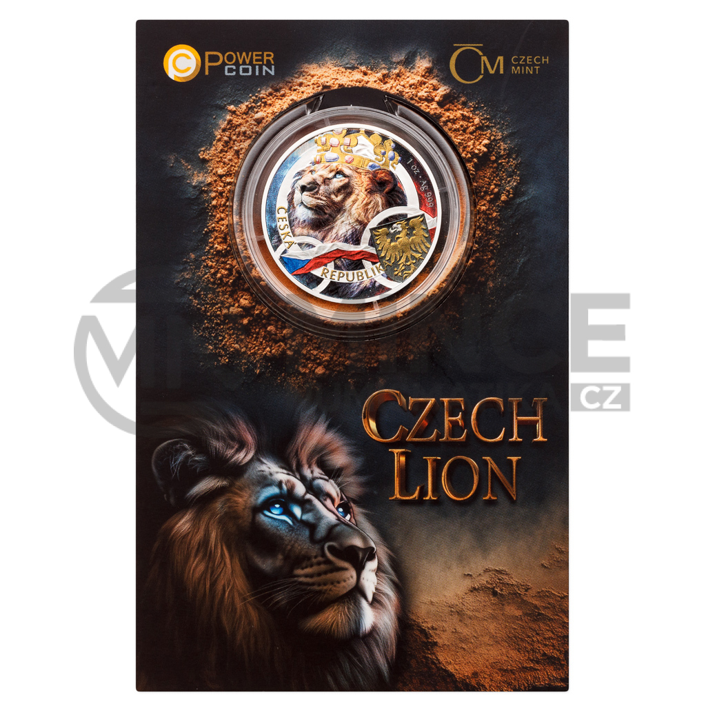 Českým heraldickým zvířetem je odpradávna lev. Tato majestátní šelma byla symbolem síly a odvahy, ale také divokosti a zápalu, které Čechové prokazovali na středověkých bojištích. Díky investičním mincím se lev stal rovněž světoznámým nositelem bohatství a prosperity. Investiční mince „Český lev“ vycházejí v řadě variant, ale tato uncová stříbrná ražba je výjimečná. Společná licencovaná emise, která se pyšní provedením proof a propracovaným kolorováním, je plodem dlouhodobého partnerství mezi Českou mincovnou a italskou společností Power Coin.