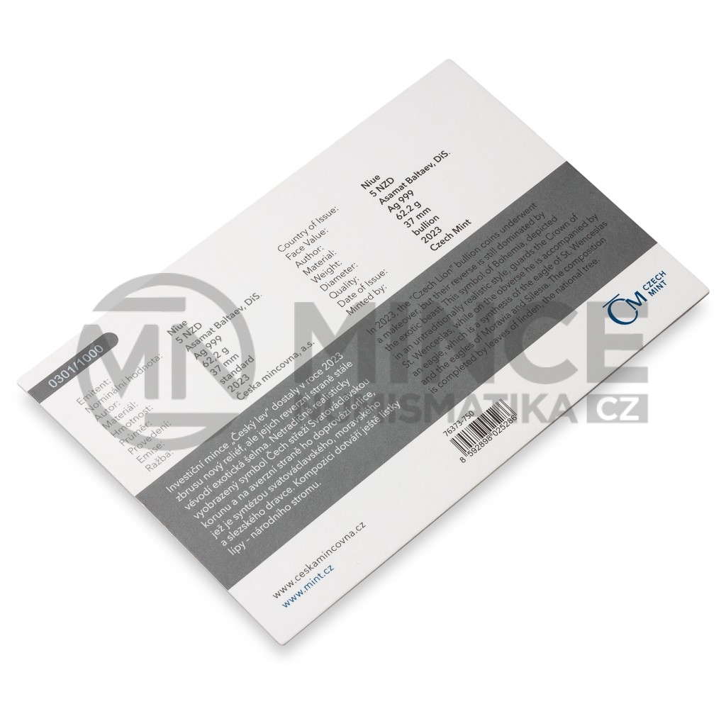 Světové investiční mince bývají věnovány silným národním symbolům a ani „Český lev“, který je první ražbou svého druhu určenou pro český trh, není výjimkou. Hmotnost stříbrné mince České mincovny s ročníkem 2023 činí dvě trojské unce.