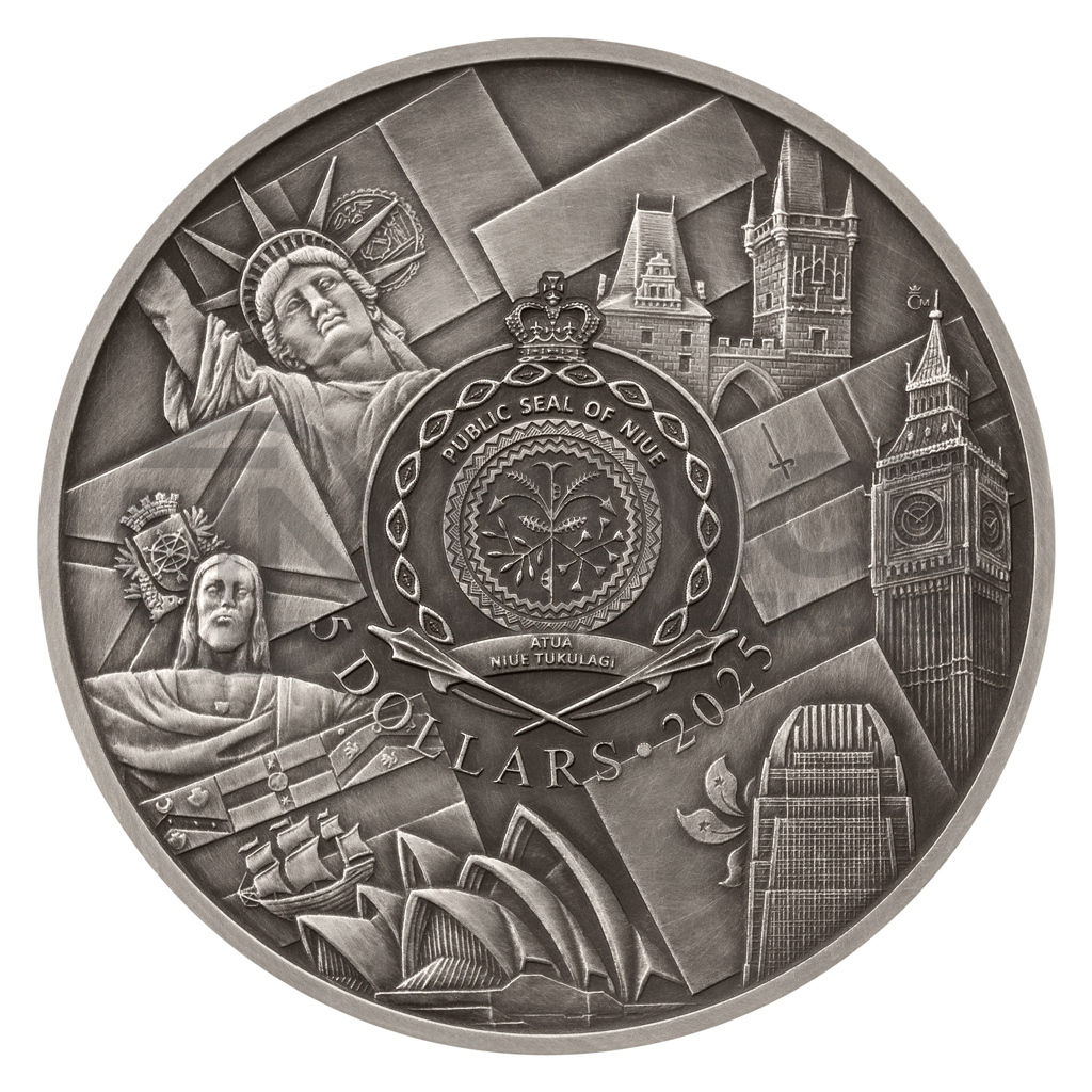 Reverzní straně mince, která je dílem medailéra Jiřího Hanuše, DiS., dominuje gigantická socha Velkého Buddhy v klášteře Po Lin. Protikladem tohoto náboženského symbolu jsou hongkongské mrakodrapy v čele s Bank of China Tower. V reliéfu nechybějí ani typické džunky a atmosféru zářícího velkoměsta dotvářejí neonové nápisy. Kontrast jednotlivých prvků je podpořen pomocí patiny a barevných smaltů. Averzní strana, která je dílem Asamata Baltaeva, DiS., a která je společná celému cyklu cestovatelských mincí, pak předkládá vlajky a pamětihodnosti světových metropolí, jakými jsou Praha, Londýn, Hongkong, Sydney, Rio de Janeiro a New York. Protože mince České mincovny vycházejí v zahraniční licenci ostrova Niue, nesou na averzu ještě jeho státní znak, nominální hodnotu 5 DOLLARS (NZD) a rok emise 2025.
