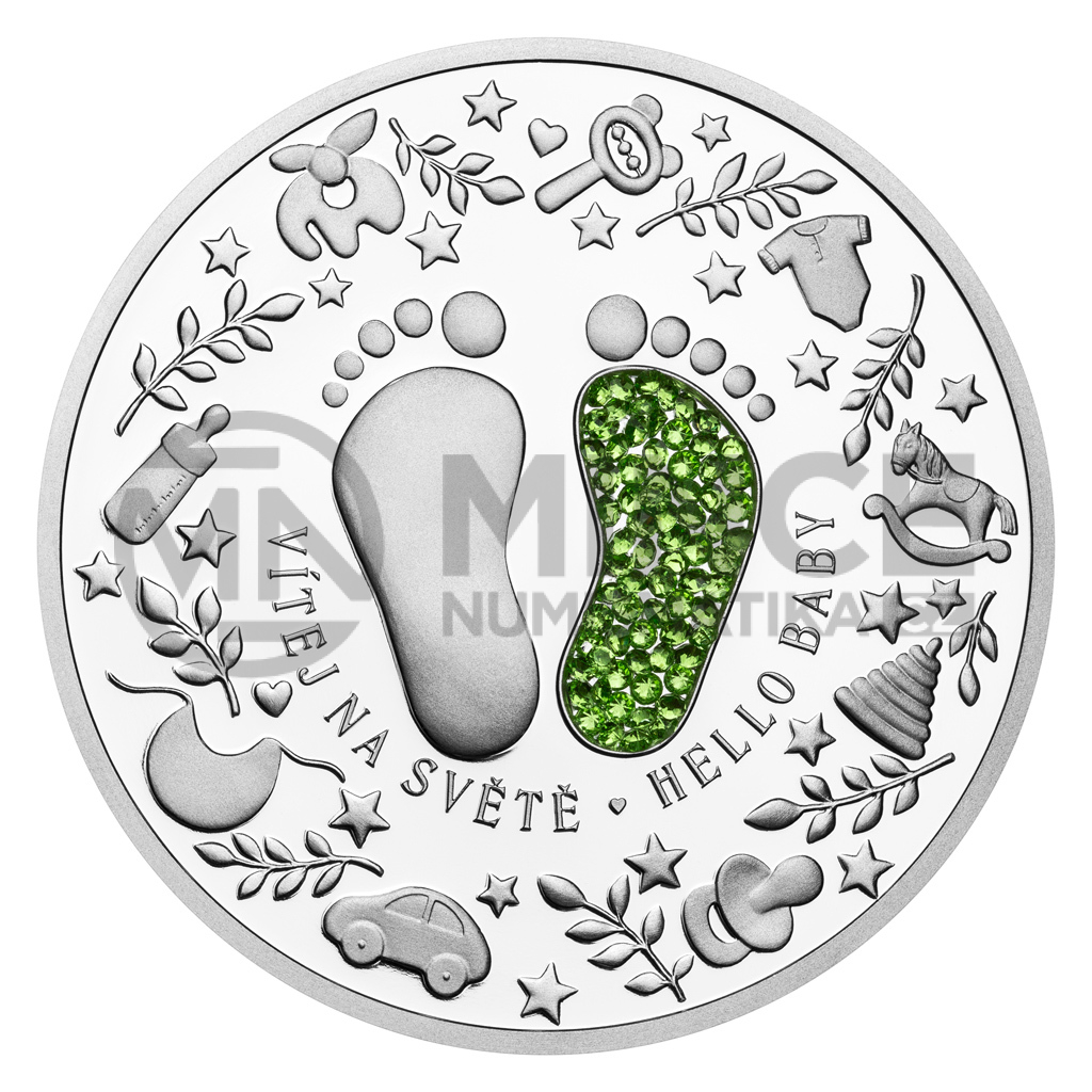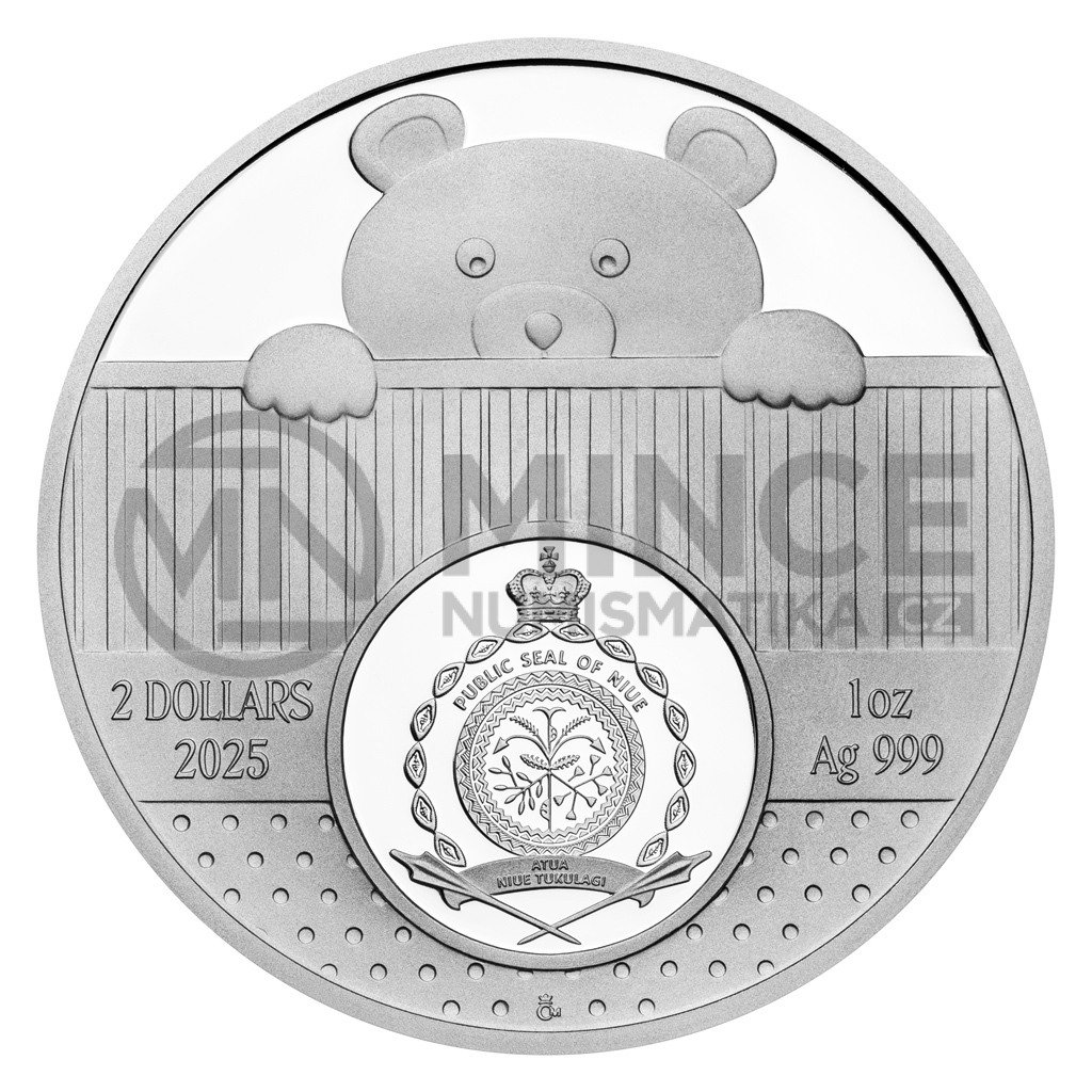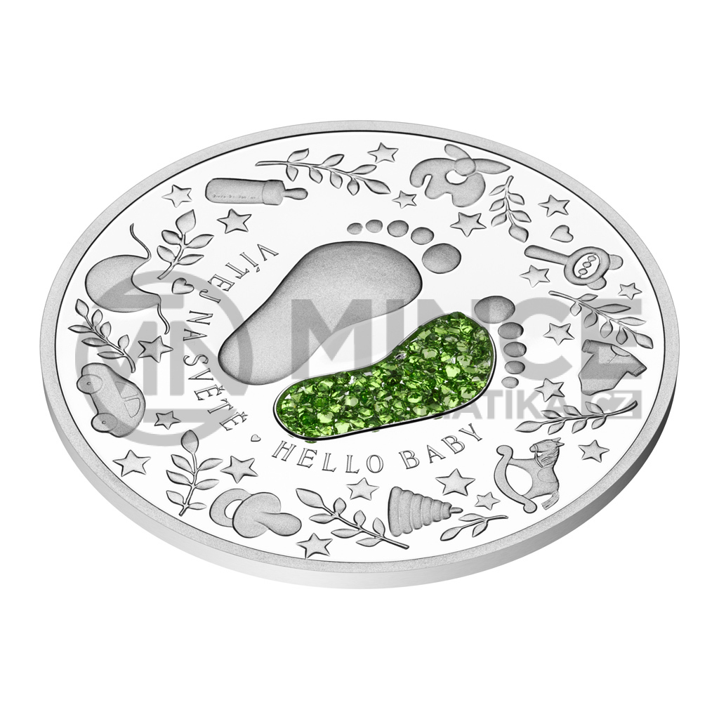 Reverzní strana pamětní mince předkládá kombinaci raženého reliéfu, broušeného českého křišťálu a tradiční symboliky. Nožičky novorozeného miminka jsou drobné, křehké a roztomilé – rostou jako z vody a připomínají, jak bylo děťátko malinké, když si ho rodiče přinesli domů. V podání medailérky Petry Brodské, DiS., nožičky doplňují ještě další dětské motivy spolu s dvoujazyčným opisem VÍTEJ NA SVĚTĚ – HELLO BABY. Na averzní straně pak najdete plyšového medvídka. Protože mince České mincovny vycházejí v licenci zahraničního emitenta, kterým je ostrov Niue, nese averz ještě jeho nezbytné atributy – státní znak, nominální hodnotu 2 DOLLARS (NZD) a rok emise 2025.