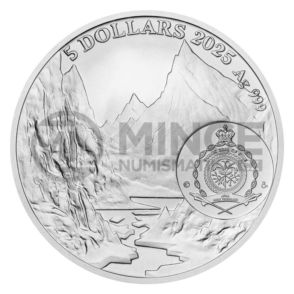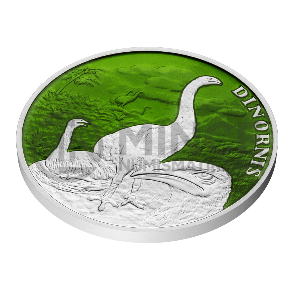 Medailérka MgA. Tereza Eisnerová vyobrazila na reverzní straně mince hejno ptáků moa. Zatímco jeden sedí na vejcích, ostatní se rozhlížejí po okolní tropické krajině. Opis uvádí latinské jméno pravěkého druhu DINORNIS. Hřejivou atmosféru Nového Zélandu, který před tisícovkami let na rozdíl od oblastí blíže k pólům nebyl pokryt ledem a sněhem, dotváří ještě zelenohnědý smalt. Averzní krajina pak předkládá drsnou krajinu doby ledové. Protože mince České mincovny vycházejí v zahraniční licenci ostrova Niue, nesou na averzu ještě jeho státní znak, nominální hodnotu 5 DOLLARS (NZD) a rok emise 2025.