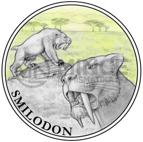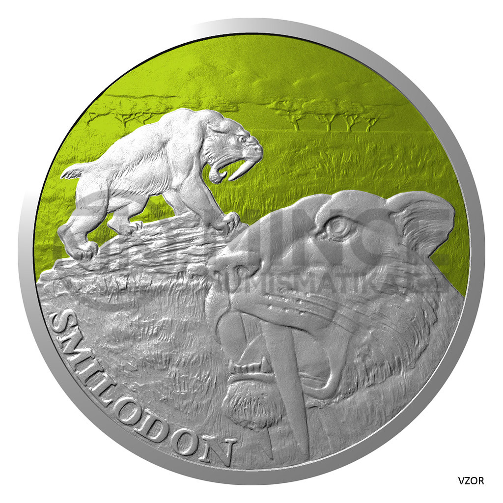 Na reverzní straně mince vyobrazila medailérka MgA. Tereza Eisnerová šavlozubého tygra hned dvakrát. V jednom případě jde o celkový pohled na šelmu, ve druhém o detail hlavy se smrtícími zuby. Opis uvádí latinské jméno pravěkého druhu SMILODON. Okolní krajina je pokryta okrovým smaltem, který evokuje atmosféru na konci doby ledové. Protože mince České mincovny vycházejí v zahraniční licenci ostrova Niue, nesou na averzu ještě jeho státní znak, nominální hodnotu 5 DOLLARS (NZD) a rok emise 2026.