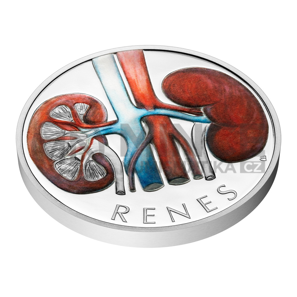 Pátá stříbrná mince České mincovny z cyklu s názvem Lidské tělo je věnována močopohlavní soustavě – konkrétně ledvinám.