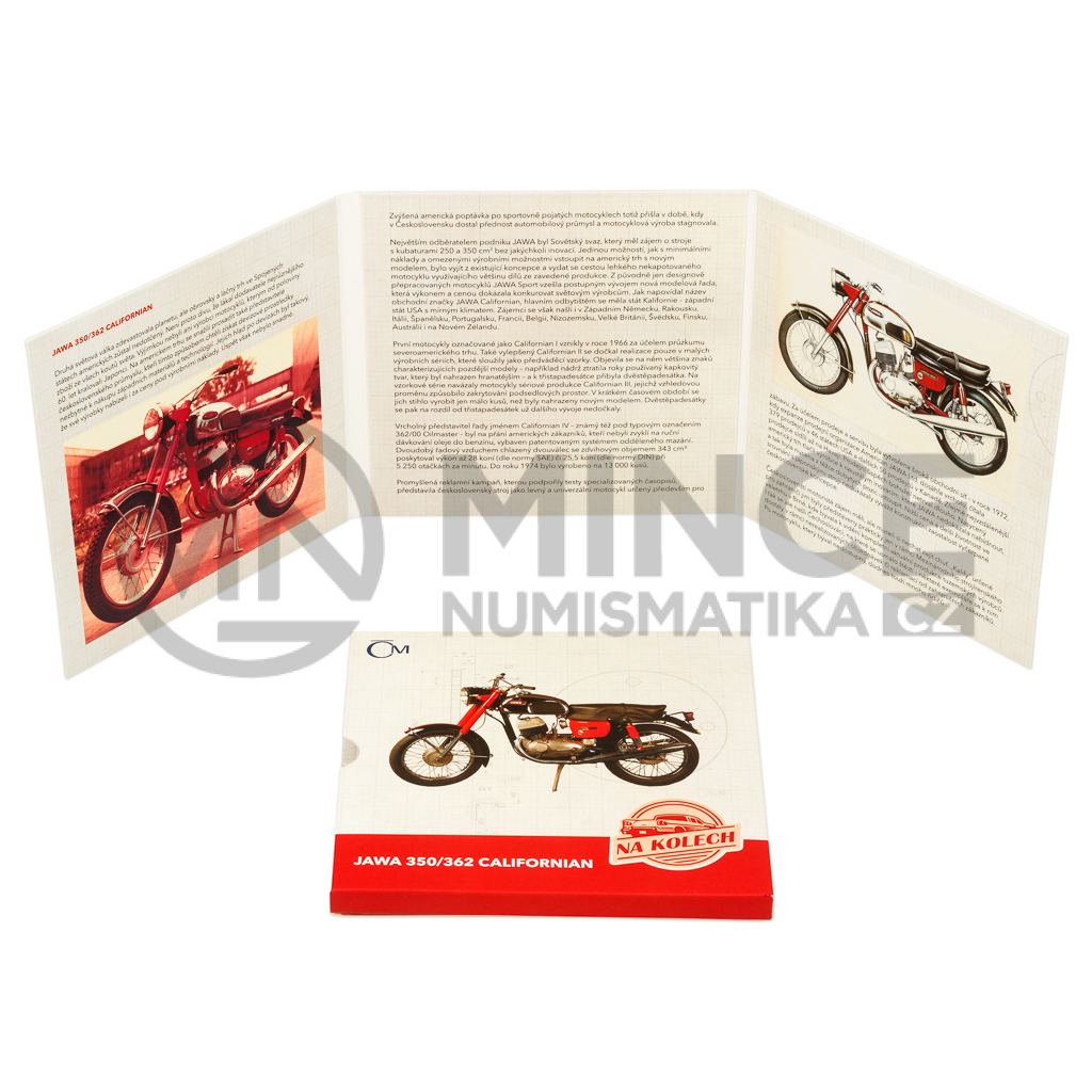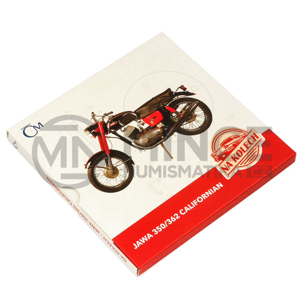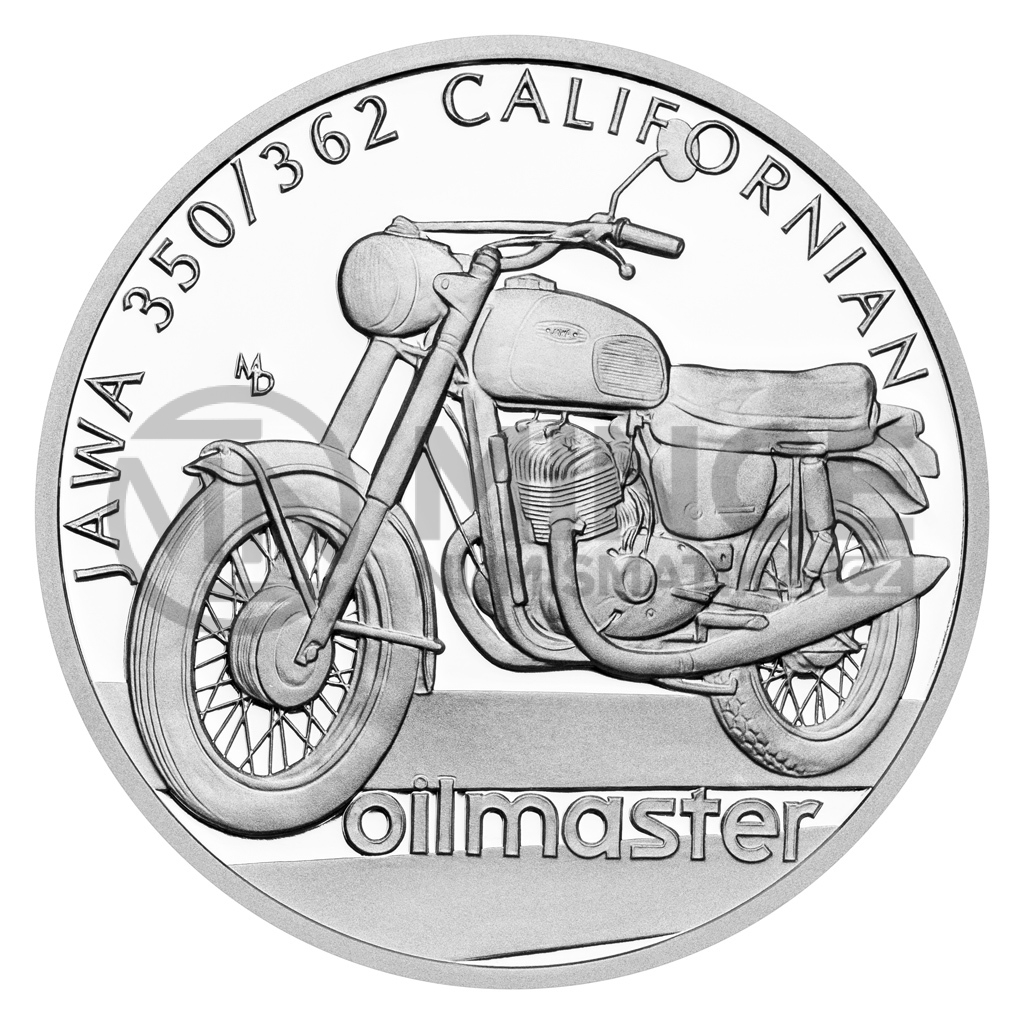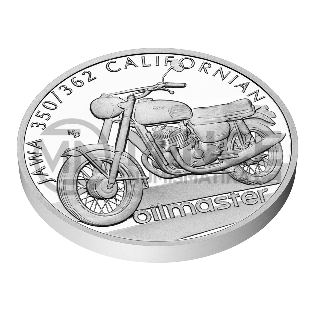 Třiadvacátá stříbrná mince České mincovny z cyklu Na kolech vzdává hold motocyklu JAWA 350/362 Californian, který okouzlil motoristy za velkou louží.