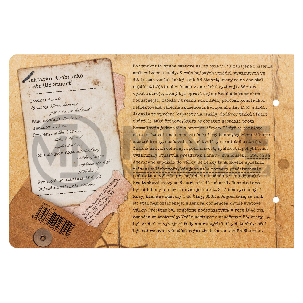 Stroj s označením M3 Stuart byl prvním tankem americké výroby, který zasáhl do bojů druhé světové války. Jeho sériová výroba začala v březnu roku 1941, přičemž robustní konstrukce reflektovala válečné zkušenosti Evropanů z let 1939 a 1940. Křest ohněm Stuart prodělal v severní Africe, kde ho Britové nasadili proti obávaným jednotkám Erwina Rommela. Poté, co se do války aktivně zapojili i sami Američané, se lehký tank skvěle uplatnil zejména v Tichomoří, kde jeho malé rozměry představovaly podstatnou výhodu při bojích v náročném terénu džunglí. Pro tankové bitvy se Stuart příliš nehodil – namísto toho byl oblíbený u průzkumných jednotek. Přestože si tankisté často stěžovali na nedostatečně silný kanon, vysokou siluetu a ostré hrany, oceňovali značnou úroveň ochrany, spolehlivost, rychlost a pohyblivost, kterou jim Stuart poskytoval. S 13 859 vyrobenými kusy, které se dostaly i do Číny, SSSR a Jugoslávie, se tank M3 stal nejrozšířenějším lehkým obrněncem druhé světové války. Přestože byl průběžně modernizován, v roce 1943 byl označen za zastaralý. Vedle nástupce s označením M5, který byl vrcholem vývojové řady amerických lehkých tanků, začal být nahrazován víceúčelovým středním tankem M4 Sherman…