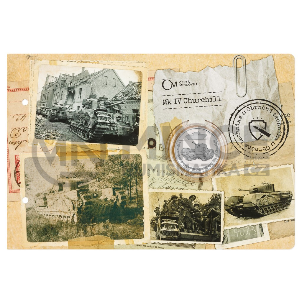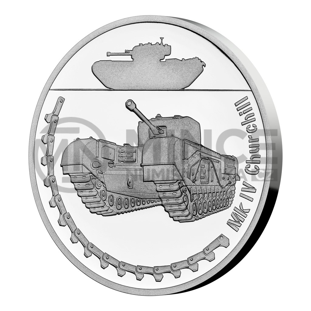 Na páté stříbrné minci České mincovny z cyklu Obrněná technika se objevuje britský tank Mk IV Churchill, který sloužil za druhé světové války.