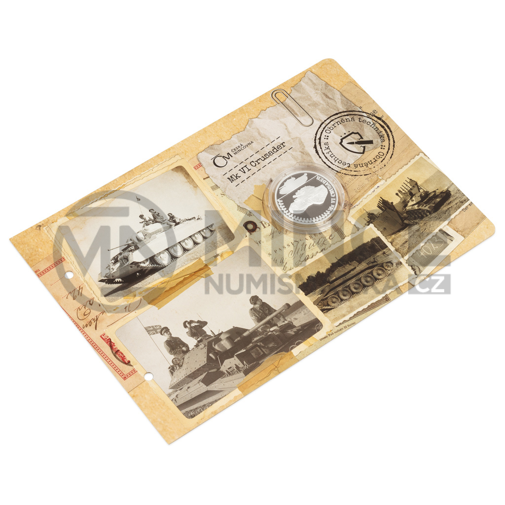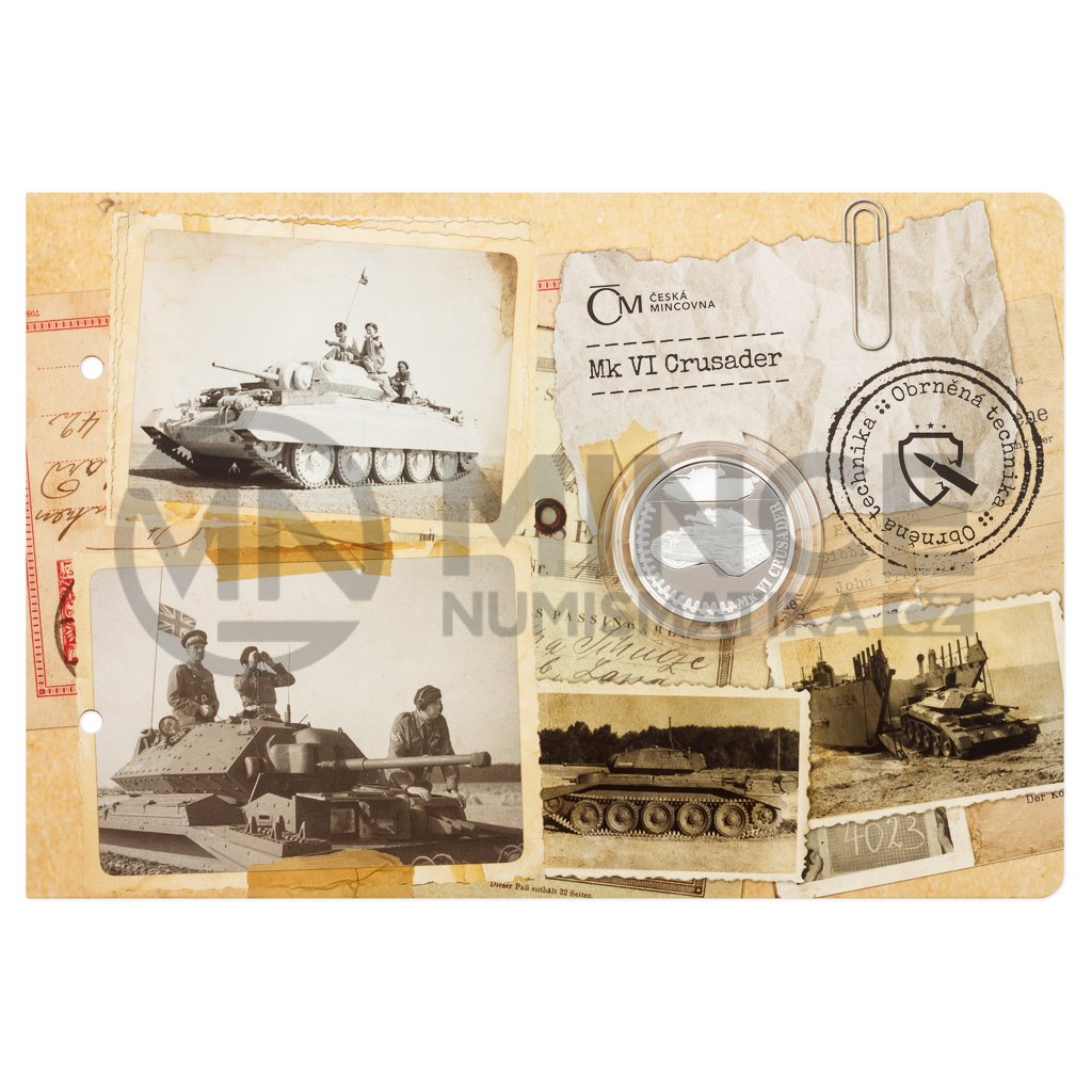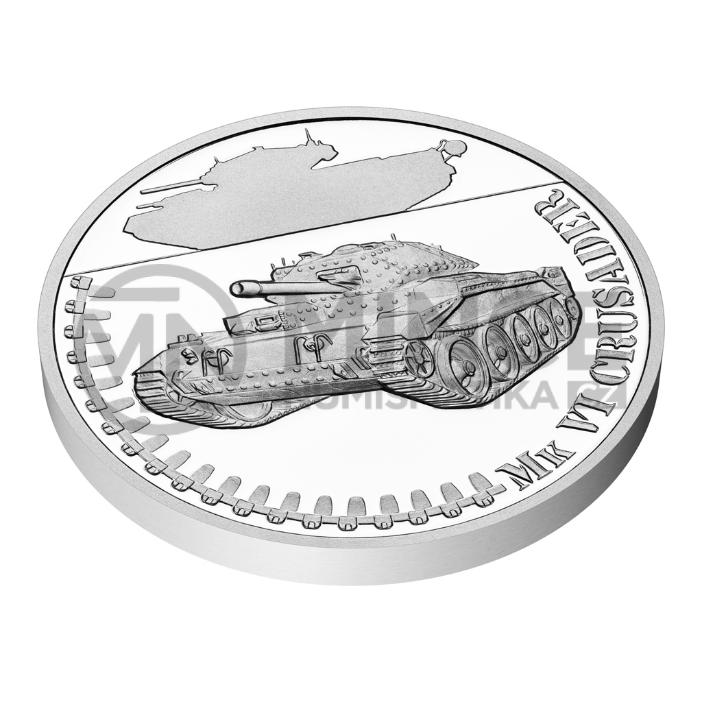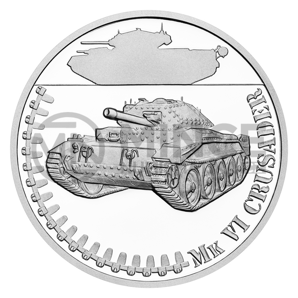 Na jedenácté stříbrné minci České mincovny z cyklu Obrněná technika se objevuje britský tank Mk VI Crusader, který sloužil za druhé světové války.