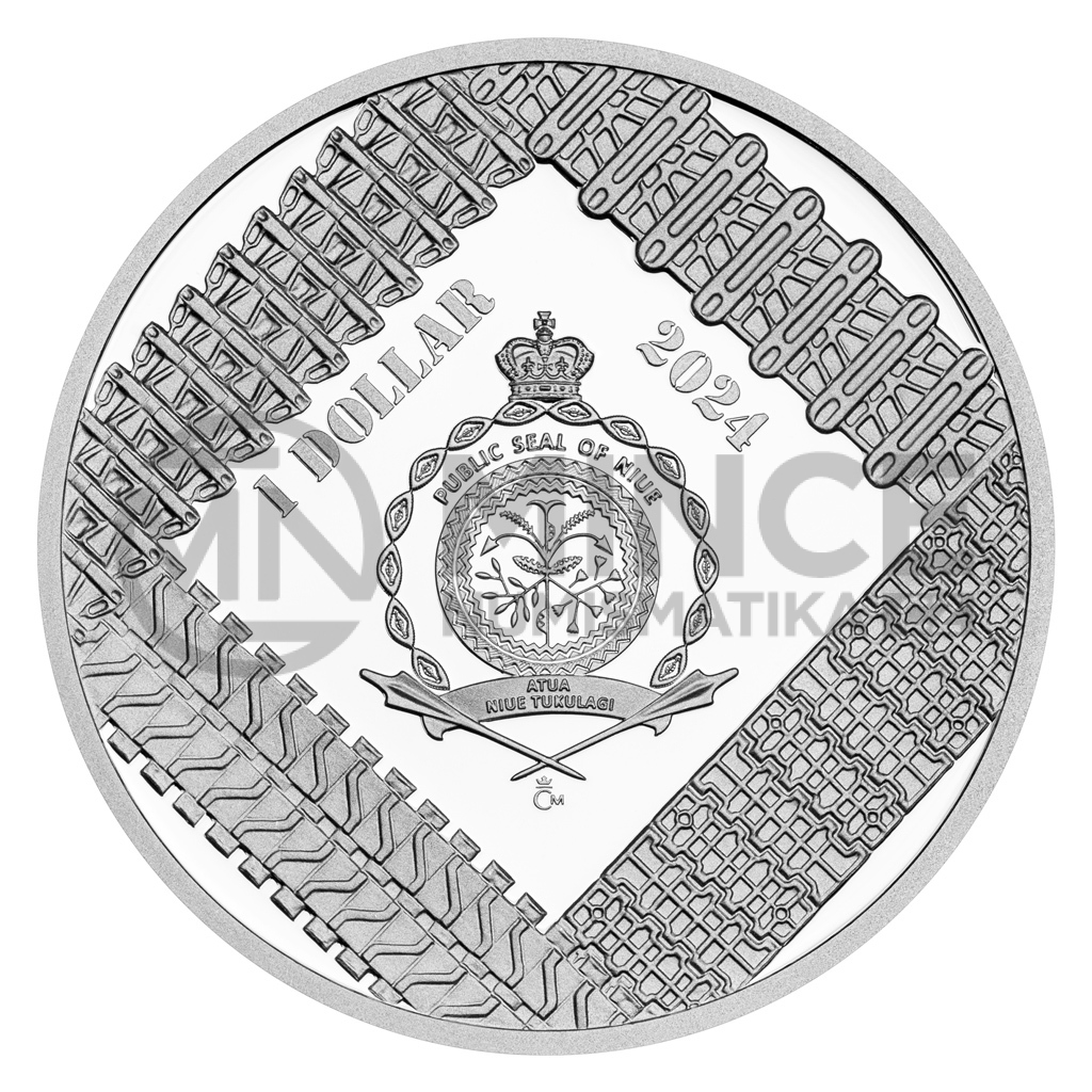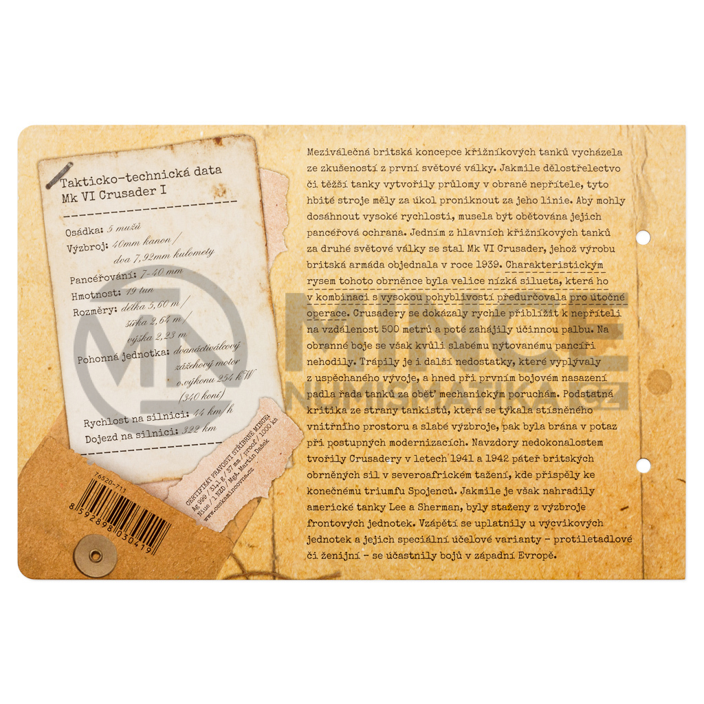 Reverzní strana pamětní mince, která je dílem medailéra MgA. Martina Daška, předkládá dvě vyobrazení britského tanku – tříčtvrteční pohled doprovází boční silueta. Kompozici dotváří opis Mk VI CRUSADER a detail tankového pásu. Pásy najdete také na averzní straně mince, která je společná celé tankistické sérii. Protože licenci k vydávání pamětních mincí České mincovny poskytuje tichomořský ostrov Niue, nese averz ještě jeho nezbytné atributy – státní znak, nominální hodnotu 1 DOLLAR (NZD) a rok vydání 2024.