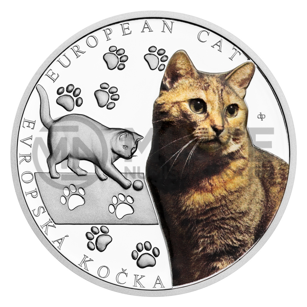 Na reverzní straně mince, která je dílem medailéra Davida Paulíka, se evropanka objevuje hned dvakrát. První vyobrazení je kolorované, a tak dává vyniknout barvě srsti. Druhé, které je reliéfní, předkládá hrající si kočku. Kompozici dotváří česko-anglický opis EVROPSKÁ KOČKA – EUROPEAN CAT. Na averzní straně, která je společná celému cyklu, pak najdete siluetu kočky a otisky tlapek. Protože mince České mincovny vycházejí v zahraniční licenci ostrova Niue, nesou na averzu ještě jeho státní znak, nominální hodnotu 1 DOLLAR (NZD) a rok emise 2026.